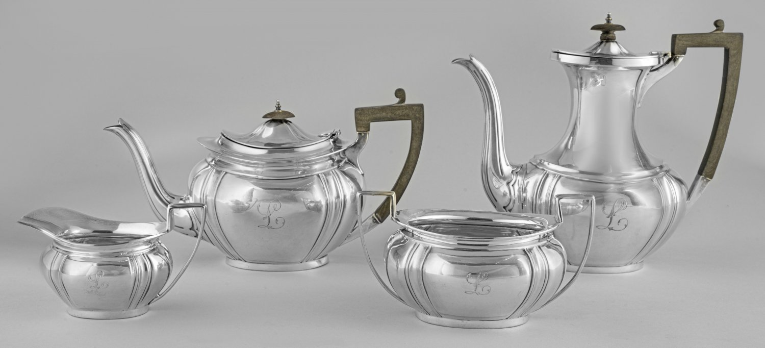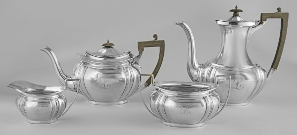 George V-Teeservice Silber. 4-tlg.; Kaffee- und Teekanne, Sahnegießer und Zuckerschale. Godronierter, ovaler Korpus mit angesetzten ebonisierten Holzgriffen und Knaufen. Tief angesetzter Ausguss. Besitzermonogr. "L". Gest. 925, Herstellerzeichen. Gew. zus. ca. 2027 g. H. 24 cm. L. 25,5 cm.
