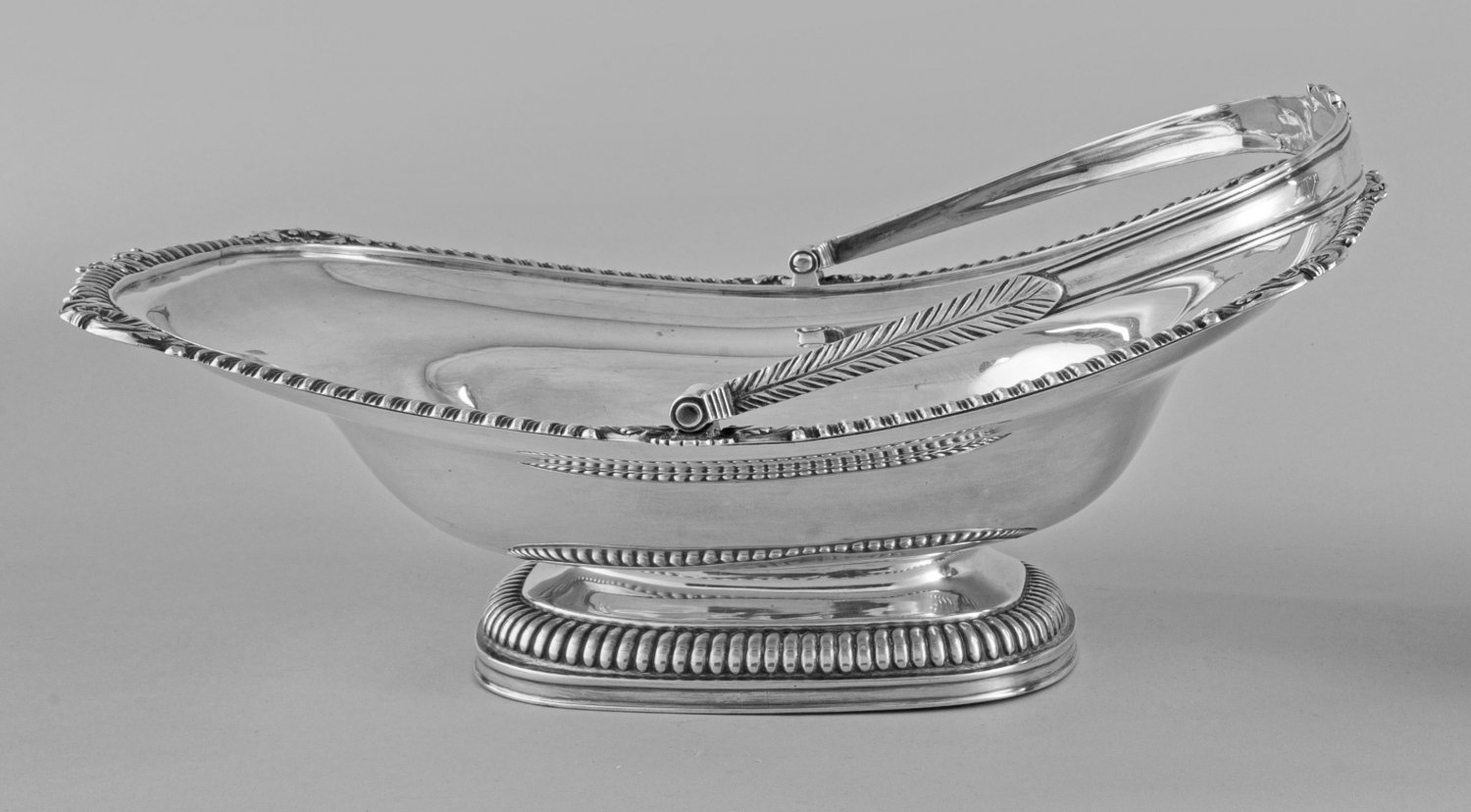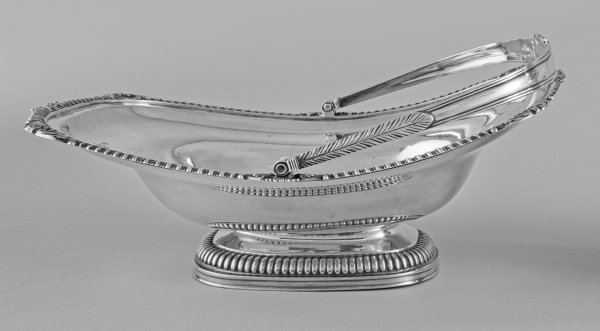 Henkelschale Silber. Über einem godronierten Stand rechteckige, weit ausschwingende Wandung mit reliefiertem Lippenrand. Graviertes Wappen im Spiegel. Gest., Stadtmarke mit Jahresbuchstabe. Rest. und Delle im Boden. Gew. 1114 g. L. 33 cm.