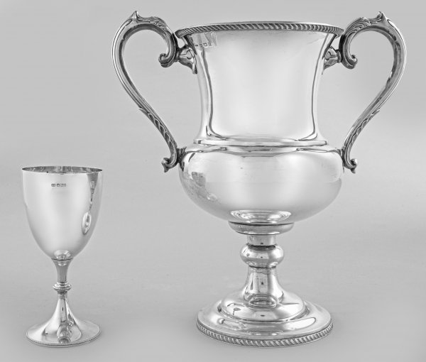 Großer Henkelkrater und Pokal Silber. 2-tlg.; Getreppter Stand mit Bandfries, in einen gewulsteten Schaft übergehend. Balusterförmiger, glatter Korpus mit Bandfries am Lippenrand. Angesetzte, geschwungene Handhaben mit reliefplastischem Blattmotiv. Dazu ein Silberpokal. Gest., Stadtmarke, Meister W G Keight & Co bzw. George Hope. Gew. zus. ca. 1460 g. H. 18,5 - 36 cm.