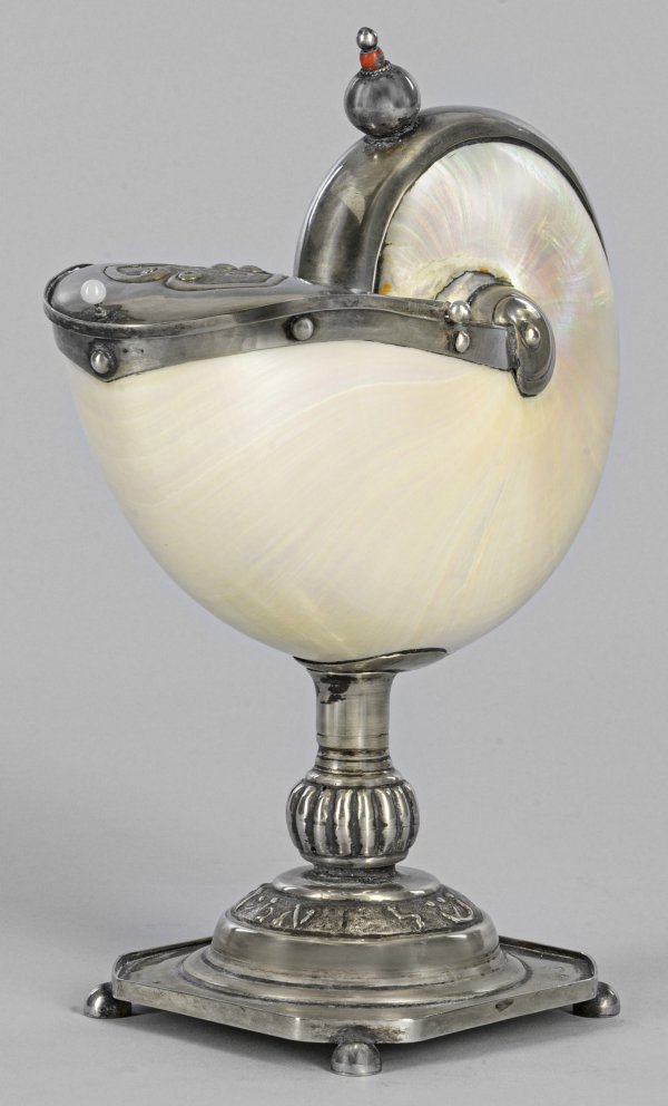 Nautiluspokal Silber. Über oktogonalem Stand mittig ein haubenartig ansteigender Sockel, übergehend in einen Schaft mit godroniertem Nodus. Darüber hell perlmutt-schimmernder Nautilus mit Silbermontierung und scharniertem Deckel. Auf dem Deckel eine Kartusche mit dem hebräischen Wort "Sukkot", das sog. jüdische Laubhüttenfest bzw. auf dem Sockel auf Hebräisch die Inschrift "Das Trinkglas des Eliyahu". Der Nautiluspokal diente als Becher, der traditionsgemäß während des sog. Pessach-Abendessens mit Wein gefüllt dem Propheten Elija gereicht wird. Gest.; 13 Lot, Pseudomarken. H. 22 cm.