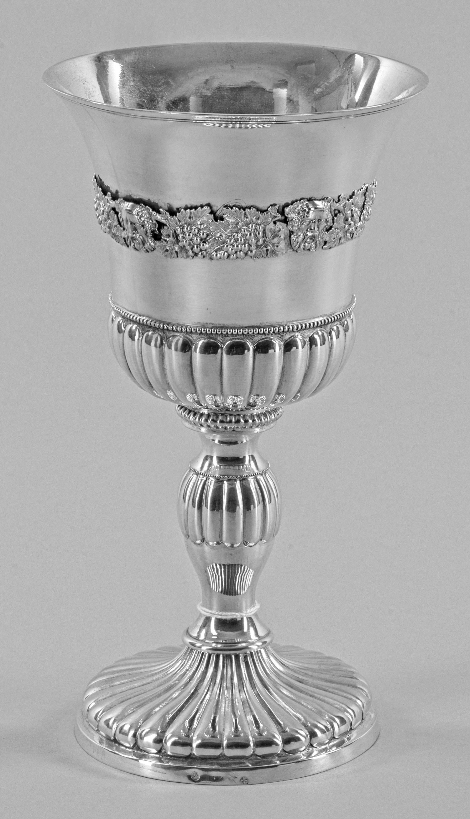 Biedermeier-Pokal Silber, teilvergoldet. Runder, trompetenförmig hochgezogener Stand und leicht konischer Schaft mit Nodus. Am Ansatz gebauchte, weit ausschwingende, glatte Kuppa, umzogen von einem plastisch gearbeiteten Reliefband mit Maskaronen und Weinreben. Stand, Nodus und Kuppa teilw. umlaufend godroniert und mit Perlfries verziert. Stadtmarke, Ältermannbuchstabe A (B.G.F. Andreack 1819-1842), Meister Johann George Wilhelm Peters (Meister 1829-1864). Gew. ca. 363 g. H. 23 cm.