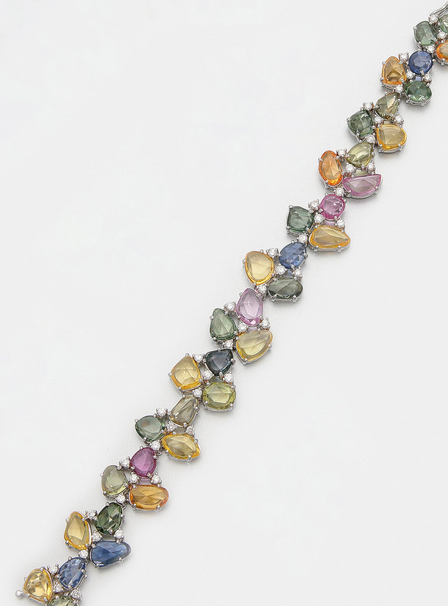 Charmantes Multicolor-Saphirarmband Weißgold, gest. 750. Schauseitig besetzt mit gelben, limonenfarbenen, kornblumenblauen und pinkfarbenen Saphiren von zus. ca. 26 ct., akzentuiert durch Brillanten von zus. ca. 1,50 ct. (H/vs-si). Gew. ca. 38,06 g.