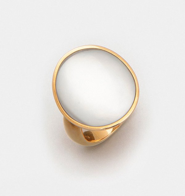 Bergkristall-Ring von Vhernier-"Giotto Piccolo", Piemont Roségold, gest. 750. Medaillonförmiger, variabler Ringkopf, besetzt mit bombiertem Bergkristall über fein geschnittenem Perlmutter in farbintensivem rosé-grün changierendem Lüster. Herstellerzeichen. Gew. ca. 24,05 g. Originales Etui.