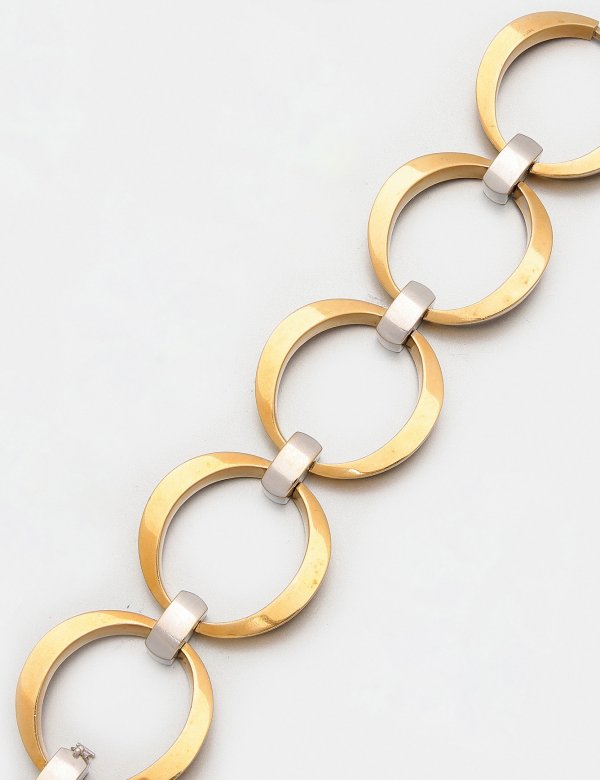 Extravagantes Goldarmband aus den 70er Jahren Gelbgold, teilw. mit Weißgold verbödet, gest. 750. Breite Bandform aus großen, runden, leicht verlaufenden Gliedern. Gew. ca. 96,93 g.
