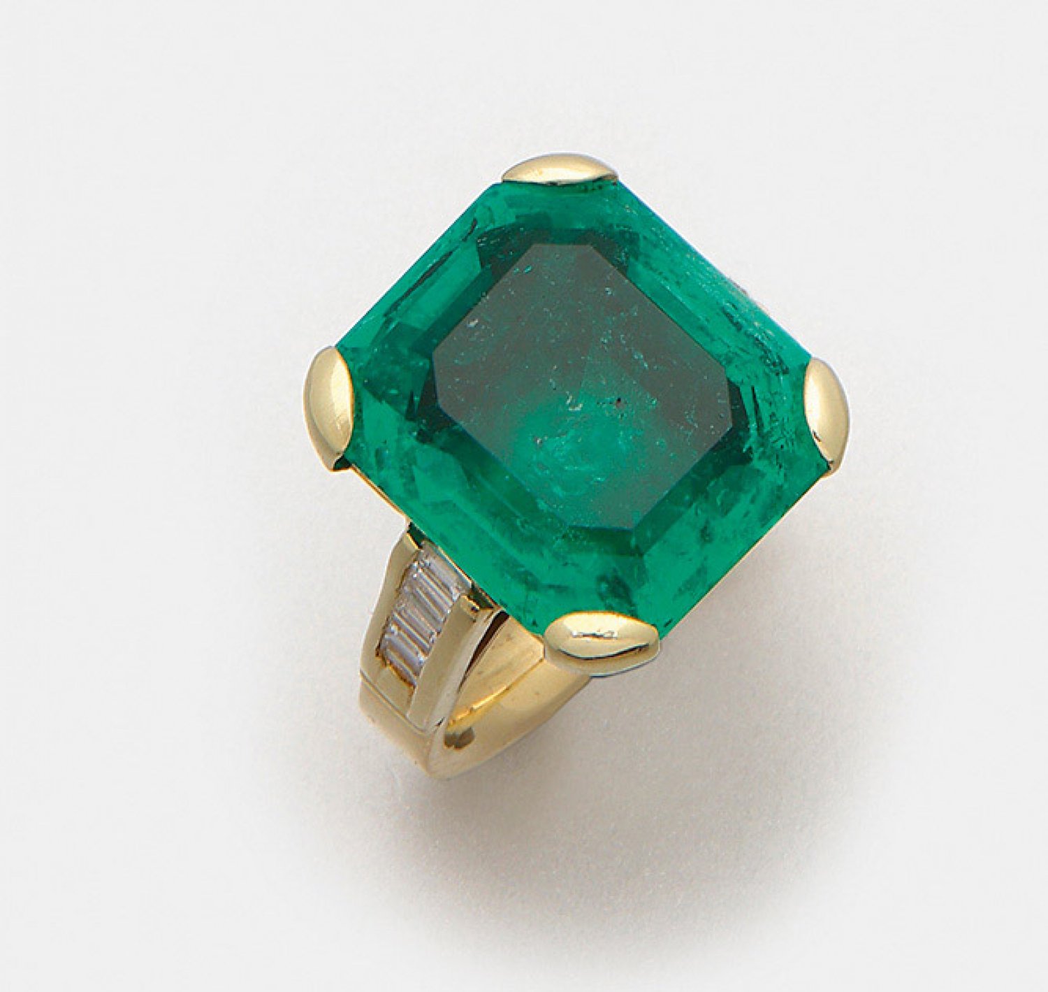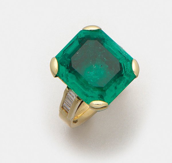 Spektakulär großer kolumbianischer Smaragdring Gelbgold, gest. 750. Zentral besetzt mit einem leuchtendgrünen "Vivid Green"-Smaragd von ca. 18,35 ct. mit sehr feinem Jardin, flankiert von Diamanten im Baguetteschliff von zus. ca. 0,35 ct. (F-G/vvsi). Gew. ca. 15,14 g.
