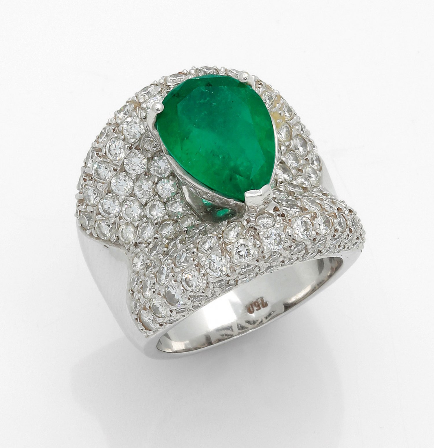 Cocktail-Smaragdring aus dem Besitz der Gräfin von Brühl Weißgold, gest. 750. Zentral besetzt mit einem leuchtend grünen Smaragdtropfen von ca. 4,90 ct., ausgefasst mit Brillanten von zus. ca. 4,30 ct. (F-G/H/vvs-vs-si) in aufwendiger Pavéfassung. Gew. ca. 21,13 g.