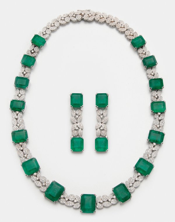 Prachtvolles Juwelen-Parure mit Sambia-Smaragden Collier und korrespondierendes Paar Ohrgehänge. Weißgold, gest. 750. Schauseitig besetzt mit insges. 19 leuchtendgrünen "Vivid Green"-Smaragden von zus. ca. 147,07 ct. im Tafelschliff mit sehr feinem Jardin und Diamanten von zus. ca. 9,16 ct. (H/vs). Ges.-Gew. ca. 124,96 g.