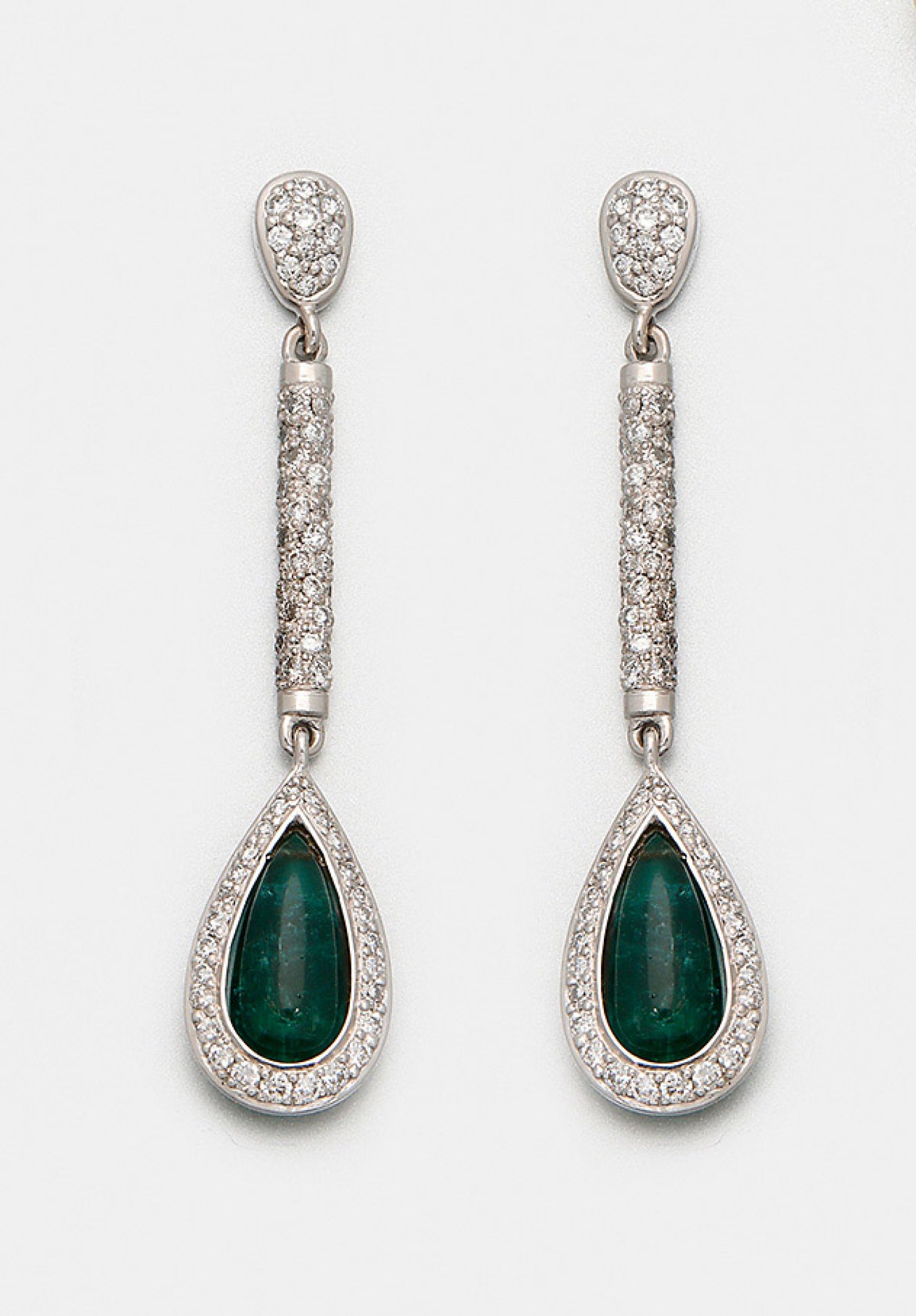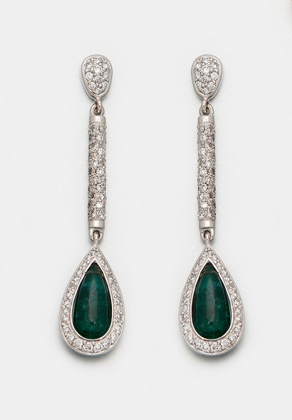Paar elegante Smaragd-Ohrgehänge Weißgold, gest. 750. Schauseitig besetzt mit zwei Smaragd-Pampeln von zus. ca. 7,25 ct., ausgefasst mit Kleinbrillanten von zus. ca. 1,30 ct. (H/pi). Ges.-Gew. ca. 9,29 g. Sehr feine Goldschmiedeausführung.