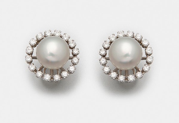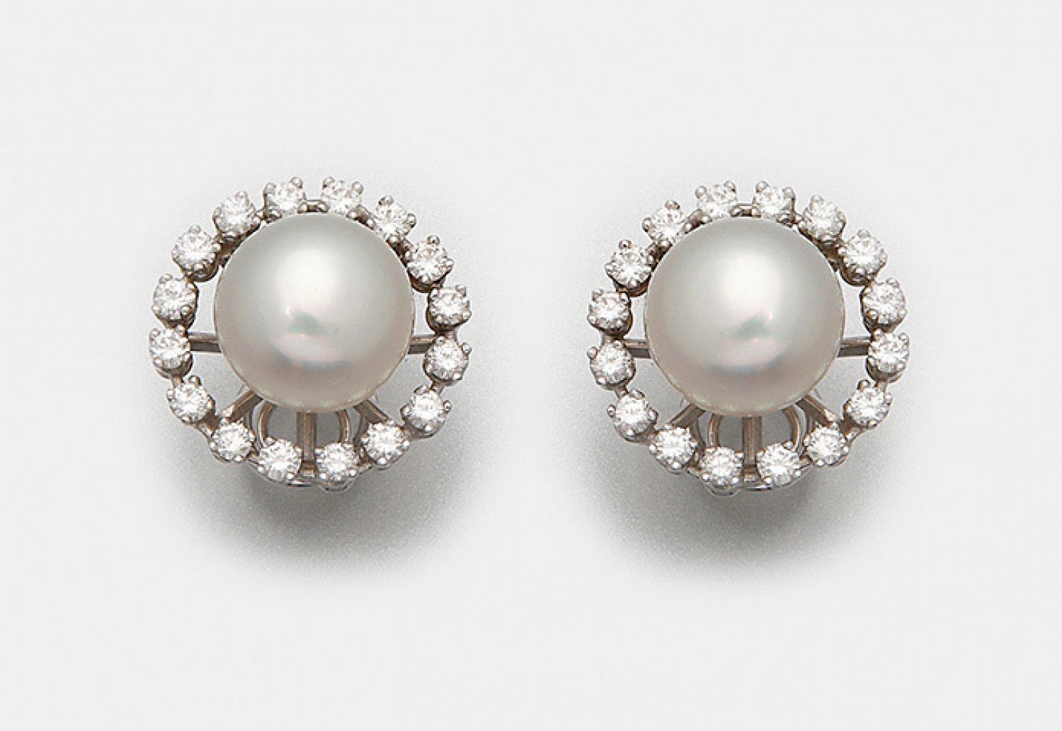 Paar elegante Südsee-Perl-Brillant-Ohrclips Weißgold, gest. 750. Zentral besetzt mit jeweils einer makellosen weißen Südsee-Zuchtperle von ca. 10,4 mm in sehr farbintensivem rose-grün changierendem Lüster, entouriert von Brillanten von zus. ca. 1,26 ct. (H-J/vs); Ges.-Gew. ca. 10,20 g.