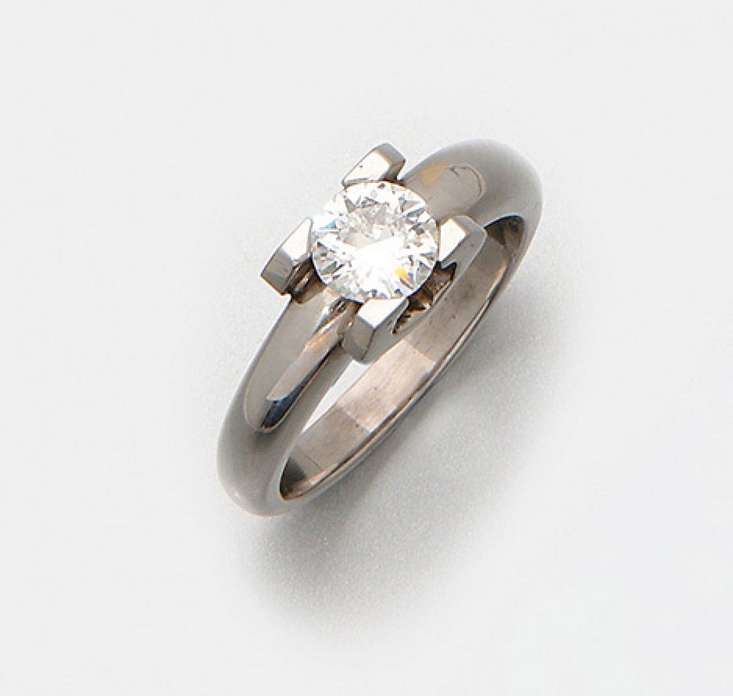 Moderner Brillant-Solitärring von Stichnoth, Hannover Weißgold, gest. 750. Zentral besetzt mit einem Brillanten von ca. 0,90 ct. (G/vvsi), in breiter C-förmiger Fassung. Gew. ca. 8,62 g.