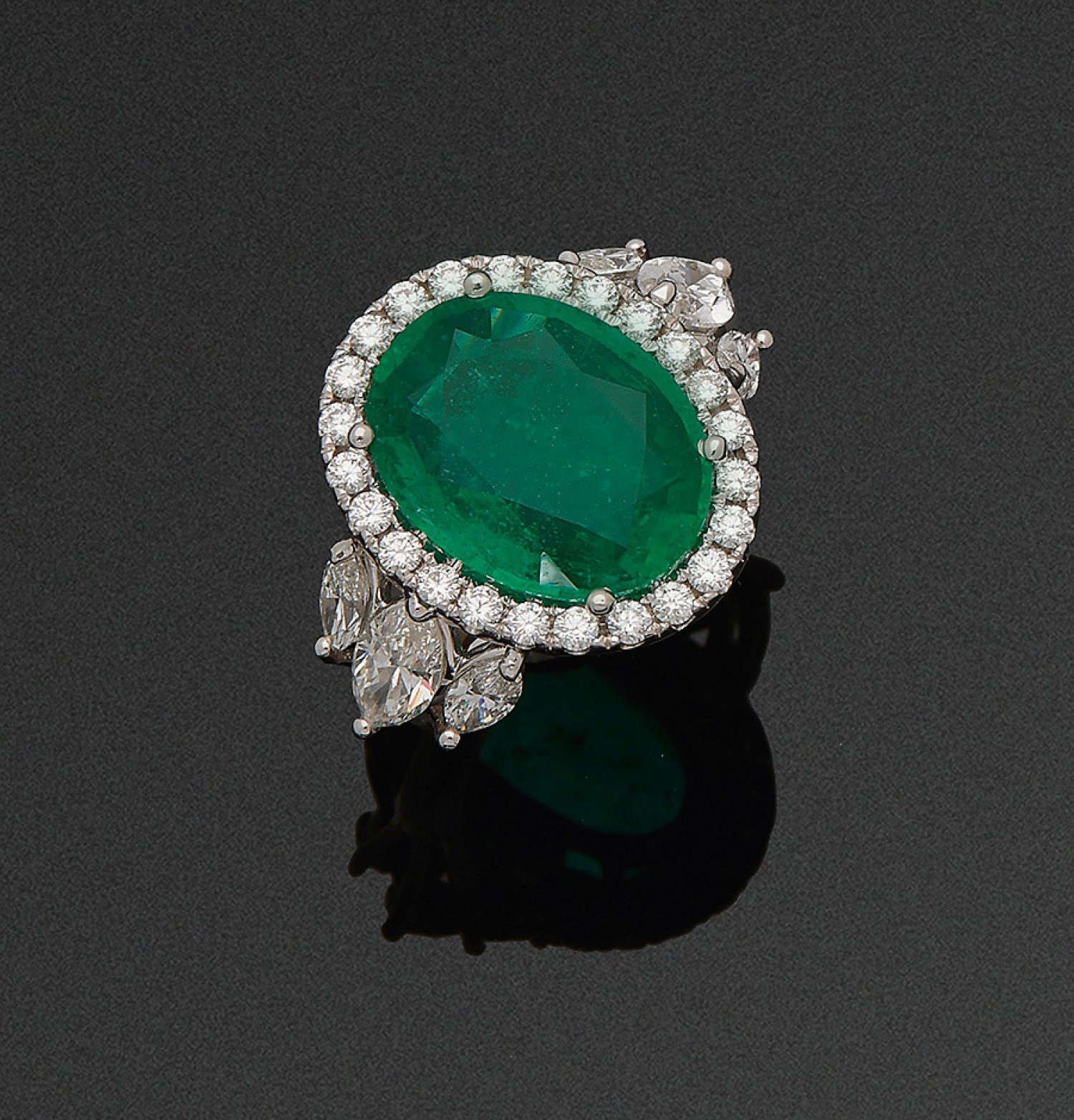 Prachtvoller Sambia-Smaragdring Weißgold, gest. 750. Zentral besetzt mit einem leuchtend grünen Smaragd im Ovalschliff von ca. 7,48 ct. in Minor-Qualität, entouriert von diversen Brillanten von zus. ca. 0,84 ct. (F-G/vs), flankiert von sechs Diamanten im Navetteschliff von zus. ca. 4,88 ct. (F-G/vs). Ges.-Gew. ca. 9,44 g.
