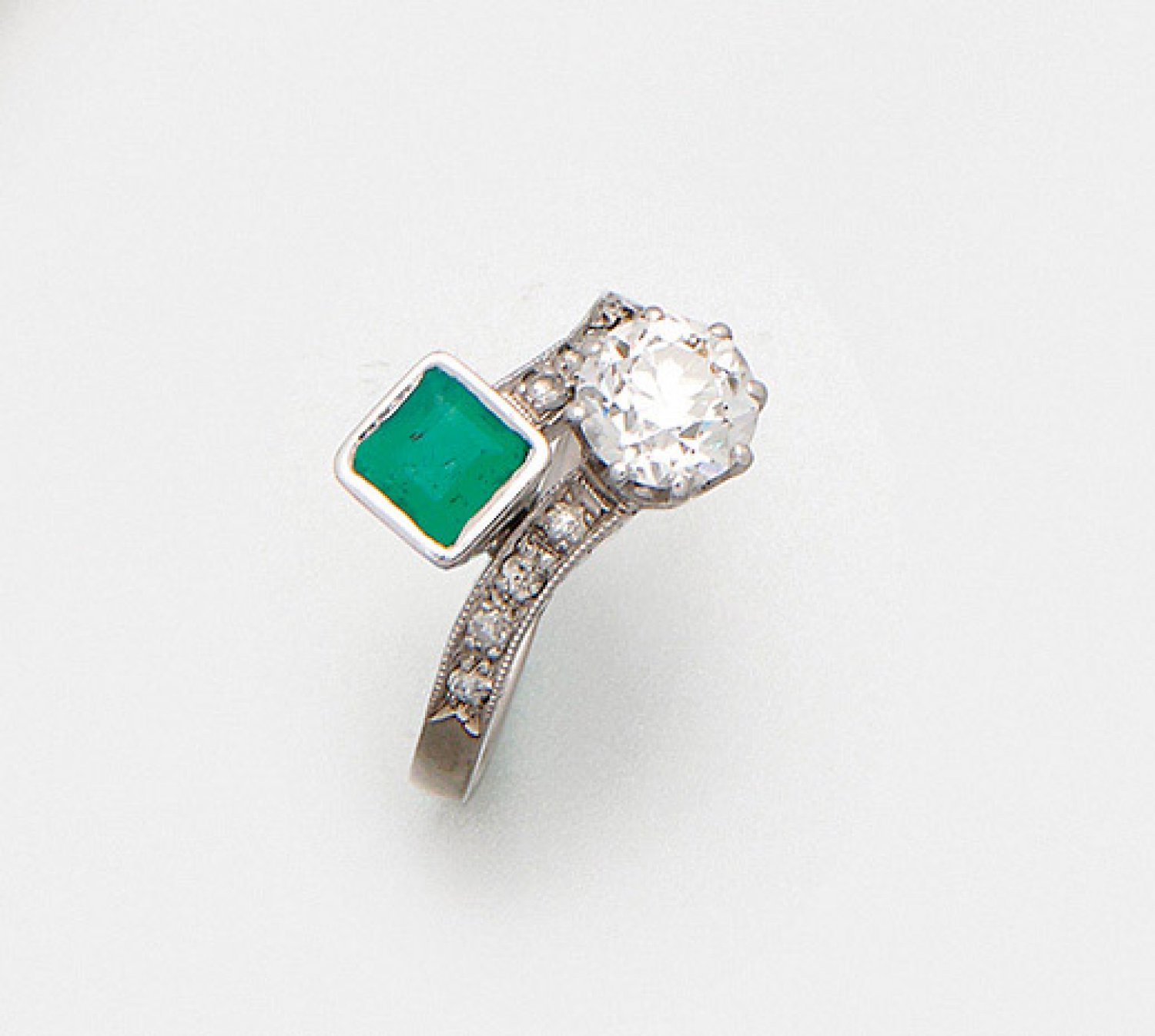 Jugendstil-"Moi et Toi"-Smaragdring Platin. Diagonal versetzte Ringschienen an den Enden besetzt mit einem leuchtendgrünen kolumbianischen Smaragdcarrée von ca. 0,40 ct. und einem Altschliffdiamanten von ca. 1,00 ct. (H-I/vs). Gew. ca. 4,24 g.