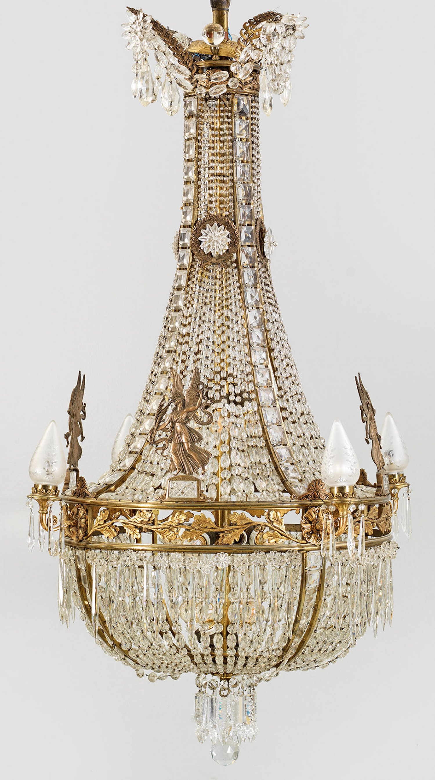 Großer Empire-Deckenlüster 4-flg.; Bronze und farbloses Kristallglas. Balusterförmiger Korpus aus Prismenschnüren im Verlauf. In der Mitte durchbrochen gearbeiteter Reif aus erhaben reliefiertem Eichblatt mit großen, reliefierten figürlichen Bekrönungen der Göttin Fama. Davon ausgehend geschwungene Leuchterarme als Träger für Leuchtmittel mit zapfenförmigen Lampenschirmen aus satiniertem Glas mit Blattdekor. Oberer Abschluss aus gestreckten Lanzettblättern. Innen 22 Lampenfassungen. Elektrifiziert. H. 140 cm. D. 90 cm.