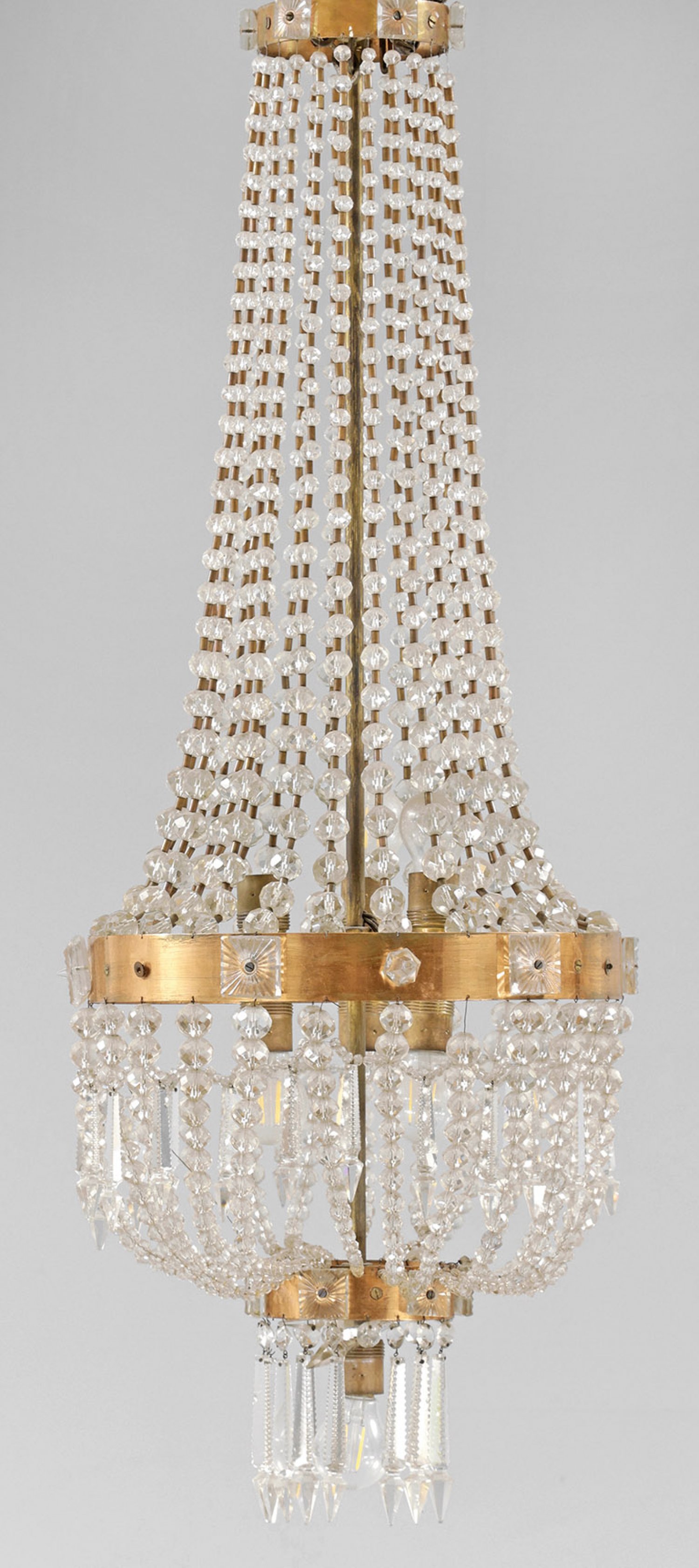 Großer Deckenlüster im Empire-Stil Kupfer, Messing und farbloses Glas. Balusterförmiger Korpus aus Prismenschnüren im Verlauf. Unterer Abschluss aus großen, facettierten Prismenstäben. Innen sieben Lampenfassungen. Elektrifiziert. Besch.; H. 110 cm. D. 41 cm.