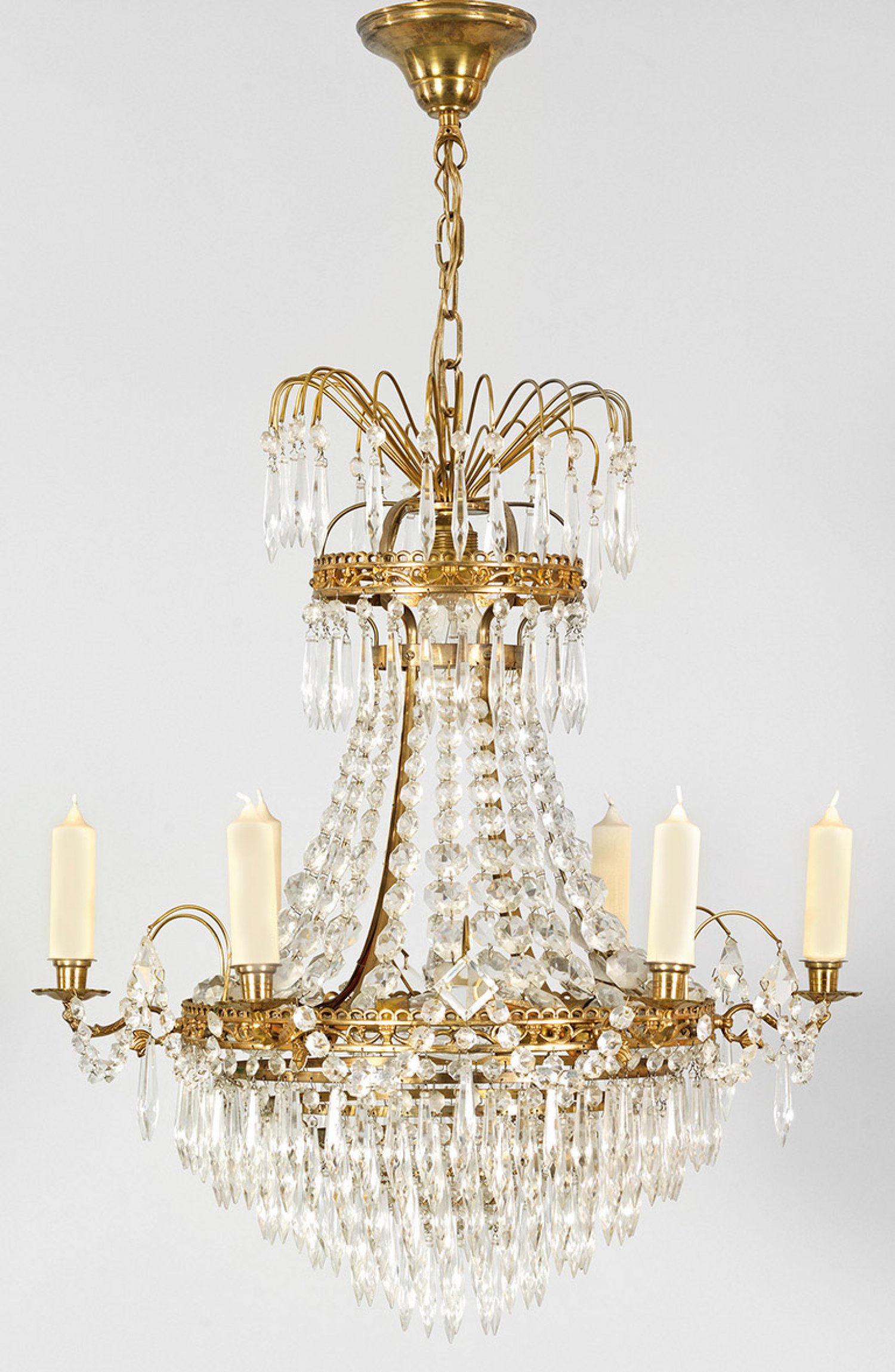 Empire-Deckenlüster 6-flg.; Messing und farbloses Kristallglas. Balusterförmiger Korpus aus Prismenschnüren im Verlauf. In der Mitte ornamentierter Reif als Träger für Leuchterarme mit vasenförmigen Tüllen, durch Prismenschnüre verbunden. Reicher Behang aus facettierten Prismentropfen. Innen sieben Lampenfassungen, elektrifiziert. Kettenaufhängung. Ges.-H. 90 cm. D. 55 cm.