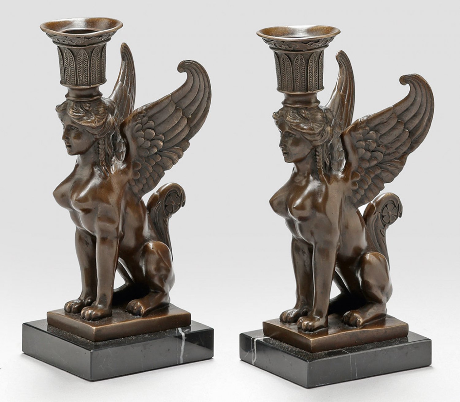 Paar skulpturale Kerzenleuchter im Empire-Stil 1-flg.; Bronze, dunkel patiniert sowie schwarzer, hellgrau gemaserter Marmor. Vollplastische Darstellung einer weiblichen Sphinx als Träger mit blattreliefierten Tüllen. H. 22 cm.