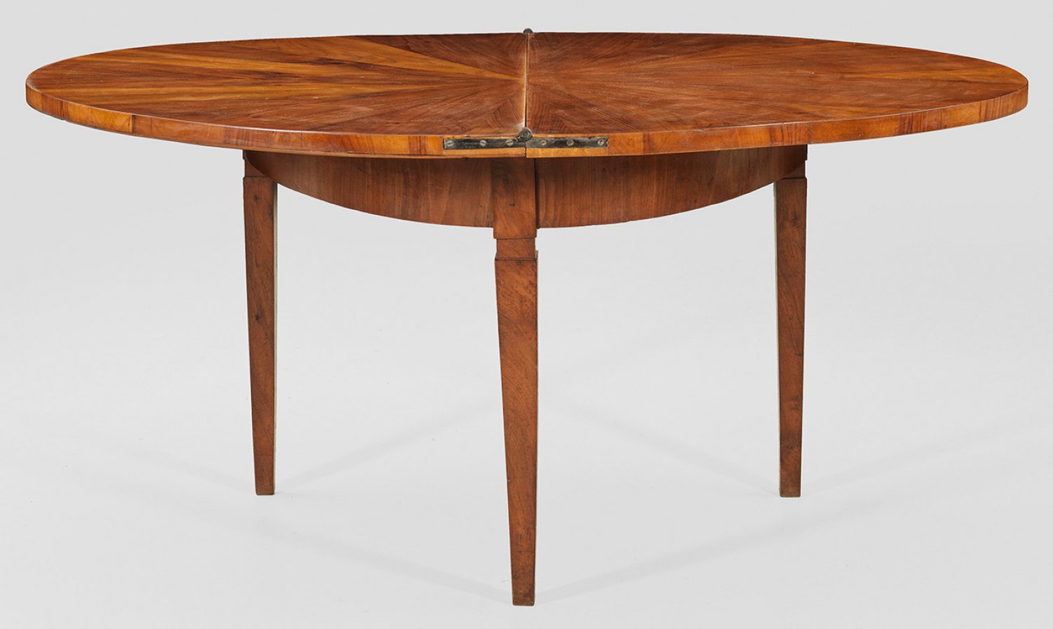 Biedermeier-Klapptisch Nussbaum furniert. Stark bombierte Zarge auf konischen Vierkantbeinen als Träger für gering überstehende, durch einen Schließmechanismus fixierbare, drehbare und aufklappbare Deckplatte mit zentriert angeordneten Furnierfeldern. H. 77 cm. 102 cm x 75/150 cm.