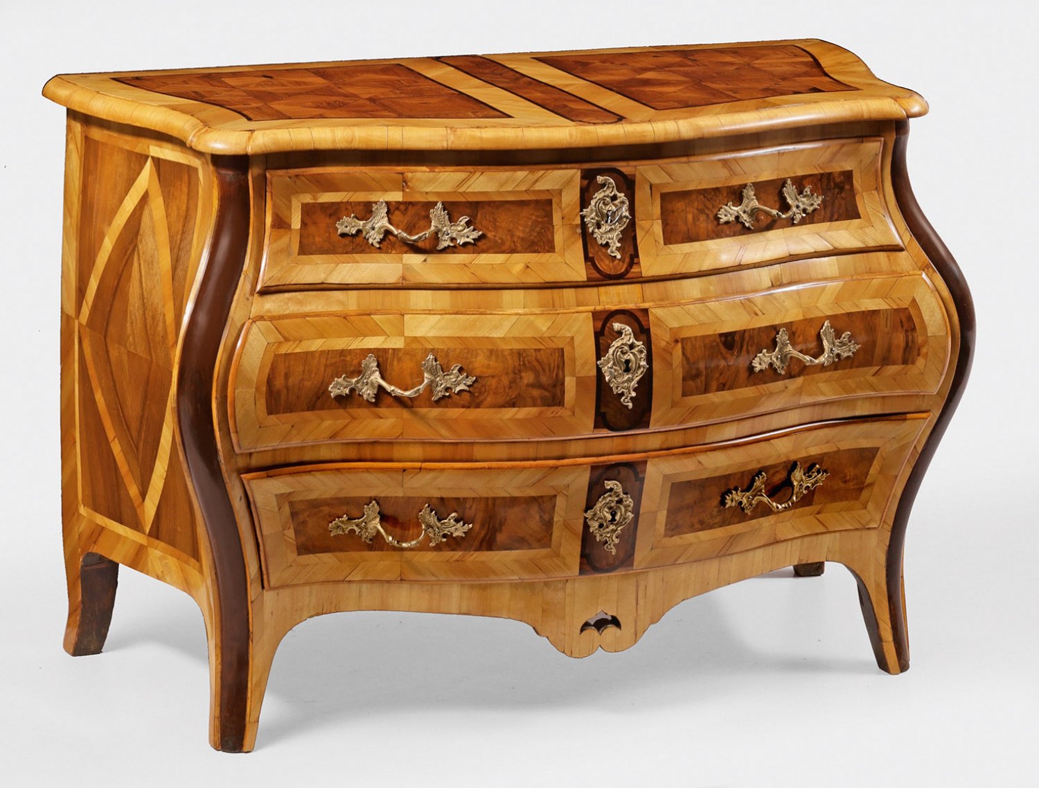 Barock-Kommode Ahorn, Nussbaum und Rosenholz, furniert sowie Einlagen aus Palisander. Dreiseitig stark bombierter Korpus, flankiert von kräftigen, gerundeten Ecklisenen, in ausgestellte Beine übergehend. In der gegliederten Front drei breite Schubladen. Korrespondierende, gering überstehende Deckplatte. Flächendeckend breit gerahmte Furnierfelder, auf der Platte aus Rautenmarketerie, von Bandeinlagen begrenzt. H. 77 cm. 116 cm x 60 cm.