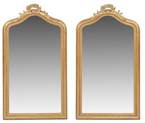 Paar große Trumeauspiegel Holz, reliefiert und vergoldet. Gerade, hochrechteckige, umlaufend profilierte Spiegelrahmung mit hochaufgeworfenem, geschweift ansteigendem Abschluss sowie Bekrönung aus üppigem Lorbeerblatt. Facettiertes Spiegelglas. H. 178 cm x 100 cm.
