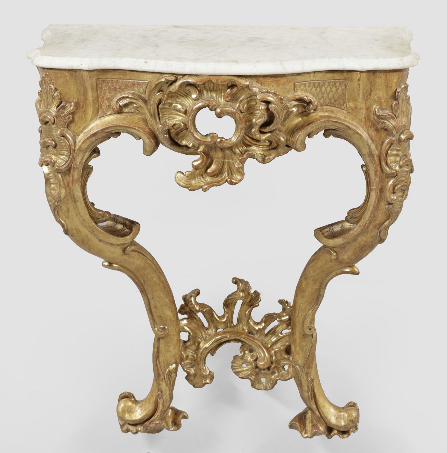 Rokoko-Konsole Holz, geschnitzt, gefasst und vergoldet. Bombierte, passig geschweifte Zarge mit Reserven aus reliefiertem Gitterwerk sowie zentraler, üppig und asymmetrisch gestalteter, durchbrochen gearbeiteter Rocaillekartusche in stark geschwungene Beine aus gegeneinander gestellten Voluten übergehend. Dazwischen durchbrochen gearbeitetes Rocailleelement. Gering überstehende Deckplatte aus weißem, hellgrau gemasertem Marmor. H. 81,5 cm. 75 cm x 44 cm.