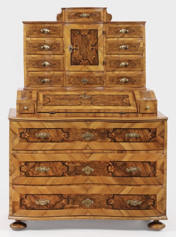 Nussbaum und Nussbaummaser furniert sowie Einlagen aus Pflaumen- und Ebenholz. Gerader, querrechteckig angelegter Korpus auf gedrückten Kugelfüßen. In der gegliederten Front drei breite, doppelt geschweifte Schubladen mit zentralem Schließmechanismus. Gering überstehende, profilierte Deckplatte als Träger für schräggestellte, abklappbare Arbeitsfläche, flankiert von kleinen Schubladen. Innen kleine Schubfächer sowie Geheimfächer. Korrespondierender Aufsatz aus bombierter Tabernakeltür, diversen Schubladen mit Zentralverriegelung sowie einschübigem oberen Abschluss. Flächendeckend breit gerahmte Furnierfelder, schauseitig von verschlungenen Bandeinlagen begrenzt. H. 153,5 cm. 111 cm x 55 cm.