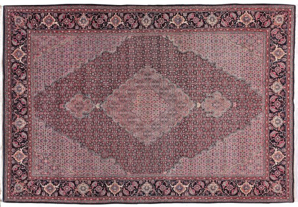Teppich mit Täbrismuster Wolle mit Seiden-Highlights auf Seide. Auf roséfarbenem Fond große, passig geschweifte Reserve sowie rautenförmiges Zentralmedaillon mit Anhängern. Flächendeckend dicht angelegte Herati Musterung. Umlaufend breite, dunkelgrundige Bordüre aus Palmetten und Blattwerk, flankiert von schmalen Nebenbordüren. 253 cm x 170 cm.
