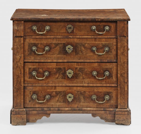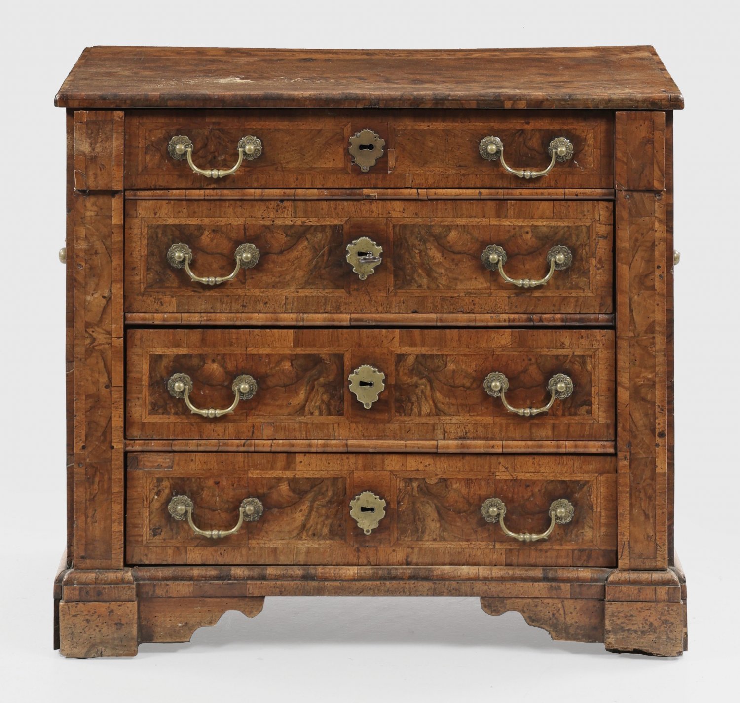 Kleine Barock-Kommode Nussbaum, furniert. Gerader, rechteckiger Korpus mit seitlichen Griffen, flankiert von flachen Pilastern auf schmaler Profilzarge und gekanteten Füßen. In der gegliederten Front vier Schubladen, die oberste mit Facheinteilung. Flächendeckend breit gerahmte Furnierfelder, von Bandeinlagen begrenzt. Gering überstehende Deckplatte aus Eichenholz. Altersspuren. H. 75,5 cm. 86 cm x 51 cm.