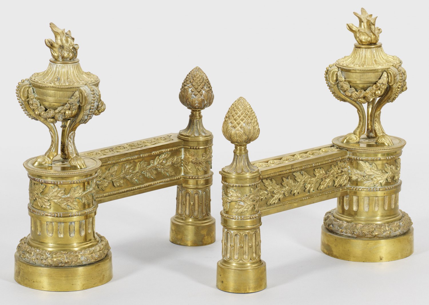 Paar große Napoleon III-Chenets Bronze, vergoldet. Zylinderförmiger, teilw. kannelierter Säulenschaft mit breitem Fries aus Lorbeer auf Rundsockel mit Eichblatt. Oberhalb balusterförmige Feuerschale mit Flammenbekrönung und umlaufenden Festons auf volutenförmigen Bocksbeinen. Korrespondierendes Pendant mit großem Pinienknauf sowie dazwischen breiter Steg mit Lorbeer. Bez. PGGF 2. bzw. 1530. H. 42 cm. B. 42 cm.