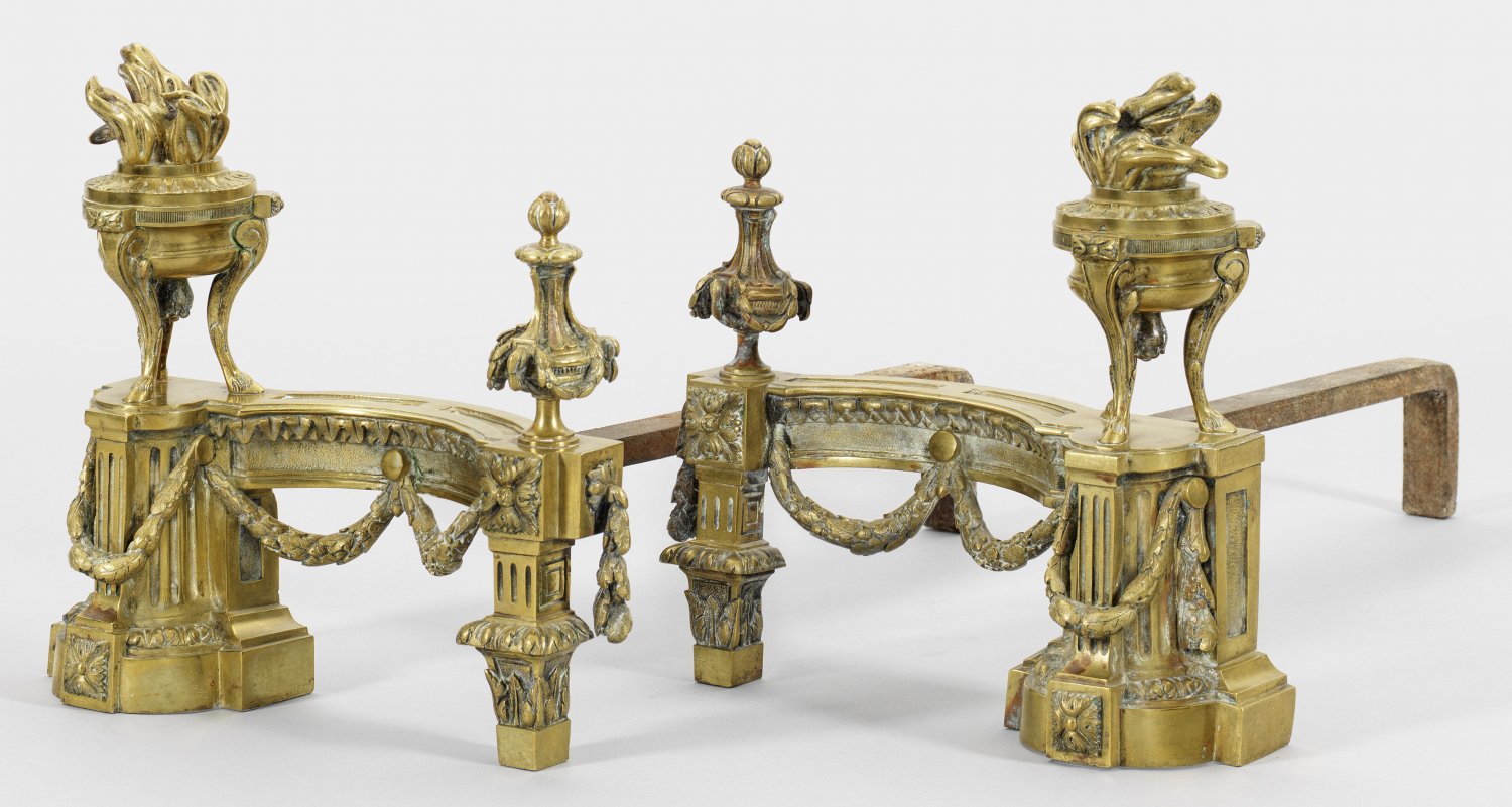 Paar Napoleon III-Chenets Bronze, vergoldet sowie Eisen. Über gestuft ansteigendem, kanneliertem Sockel große Feuerschale mit volutenförmigen Bocksbeinen und Flammenbekrönung. Balusterförmiges Pendant sowie gebogter, blattreliefierter Steg mit üppigen Festons H. 29 cm. 28 cm x 53 cm.