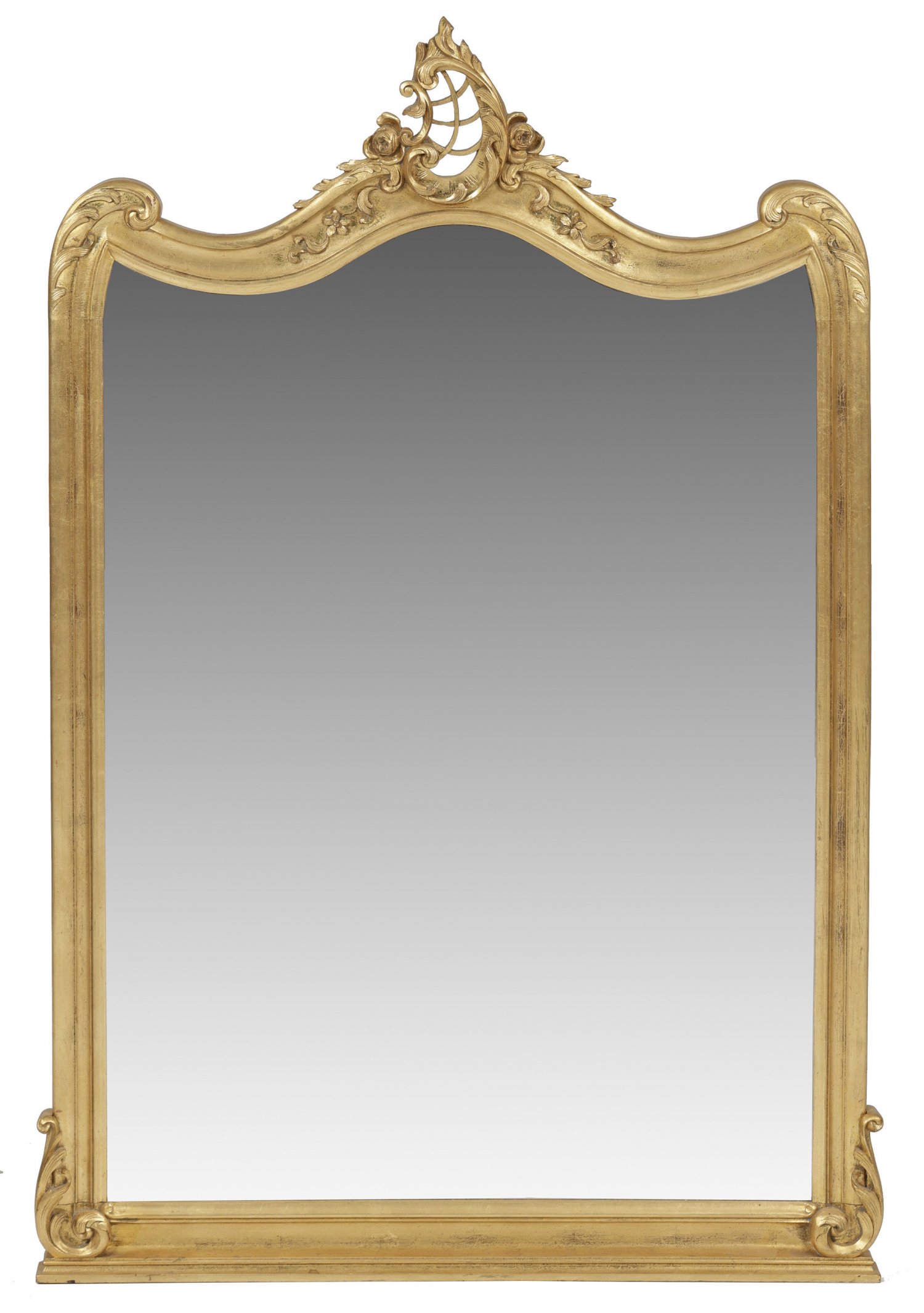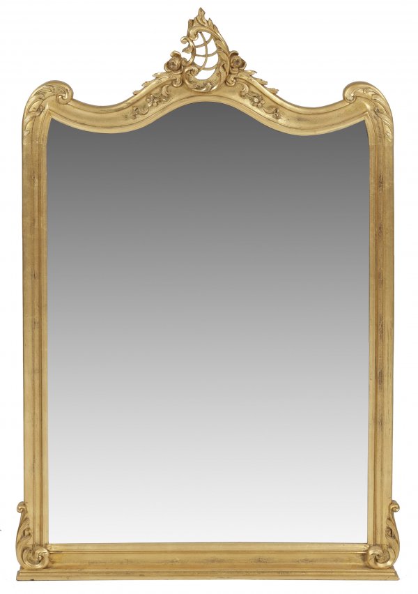 Großer Trumeauspiegel im Rokoko-Stil Holz, reliefiert und vergoldet. Hochrechteckige, profilierte Spiegelrahmung mit passig geschweiftem oberen Abschluss, flankiert von Voluten. Asymmetrisch gestaltete, durchbrochen gearbeitete Rocaillebekrönung mit Gitterwerk. Facettiertes Spiegelglas. 179 cm x 120 cm.