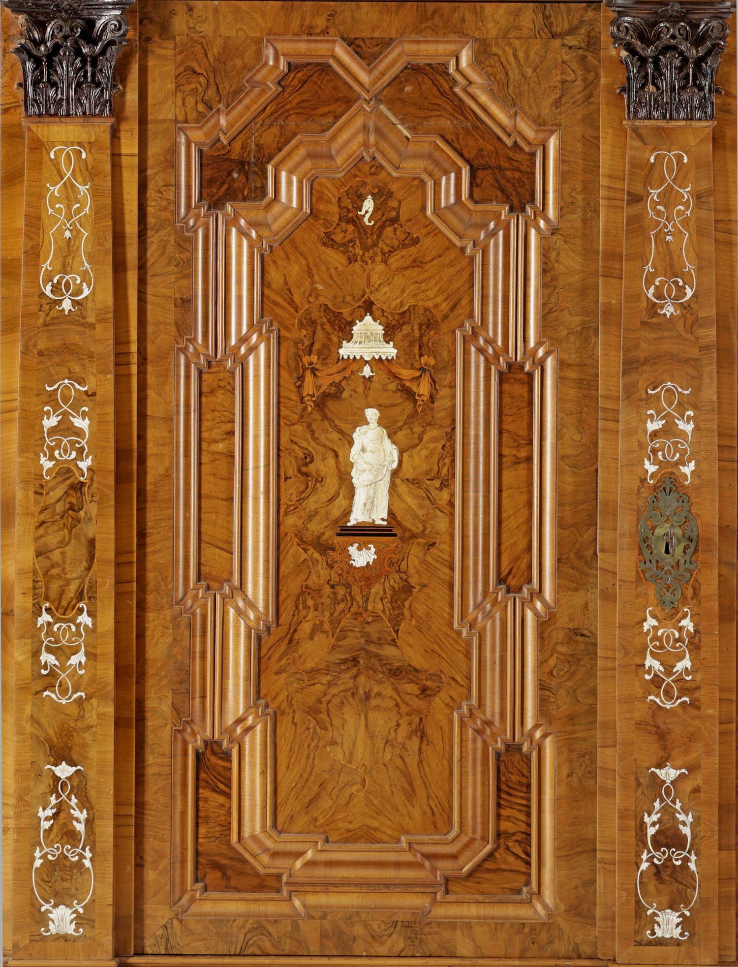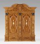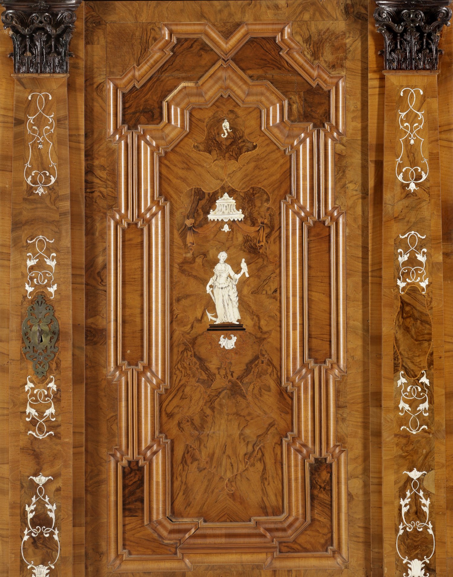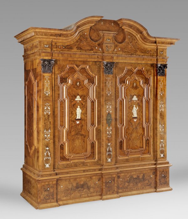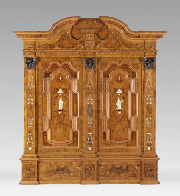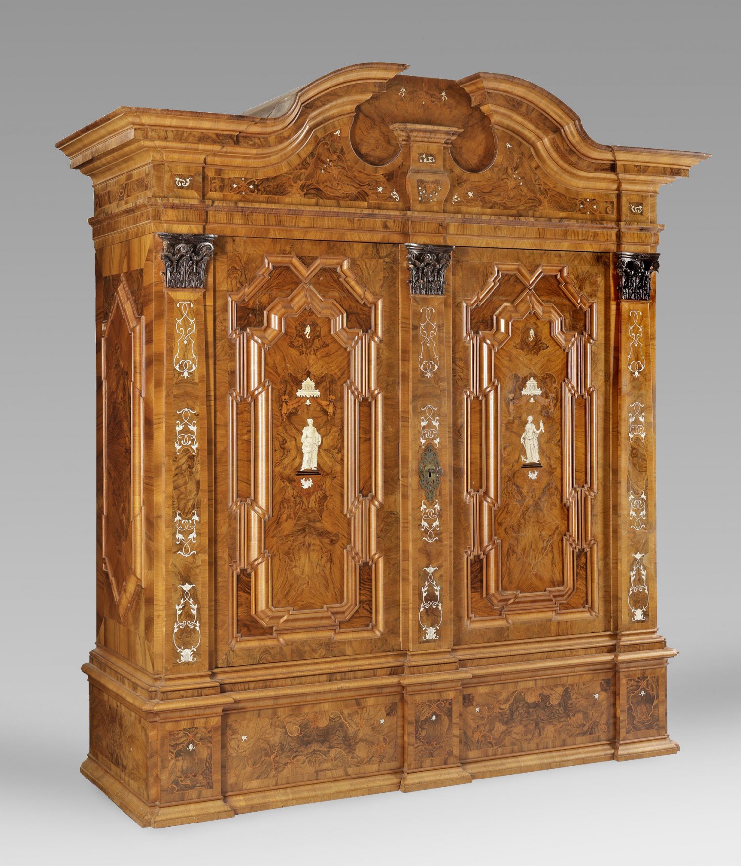 Musealer Braunschweiger Meisterschrank Nussbaum, furniert sowie Einlagen aus Eschenholz, Buchsbaum, Perlmutter und fein graviertem Elfenbein. Gerader, hochrechteckiger Korpus, seitlich mit großen sog. Bastionsfüllungen aus profilierten, kunstvoll verkröpften, spitz zulaufenden Füllungsauflagen auf breitem Zargensockel. In der gegliederten Front zwei große Türen mit entsprechenden Füllungen sowie gekehlten Profilrahmungen, flankiert von breiten Pilastern mit geschnitzten korinthischen Kapitellen. In der Mitte, unter großen Lambrequins und üppigem Draperiewerk, jeweils fein gravierte, als Gegenstücke konzipierte figürliche Intarsie in Gestalt der "Patientia" mit Lamm als Personifikation der Geduld sowie allegorische Darstellung der Hoffnung mit Anker und Papagei. Unterhalb reich gestalteter Rocaillesockel. Flächendeckend breit gerahmte Furnierfelder, von aufwändig verschlungenem Bandelwerk begrenzt. Dekorationen aus eingelegten Kelchblüten, Blattwerk und kleinen Blütenrosetten. Weit vorkragendes Profilgesims mit mittig geschweift ansteigendem, gesprengtem, hinterfangenem Giebel. H. 225 cm. 207 cm x 77 cm.