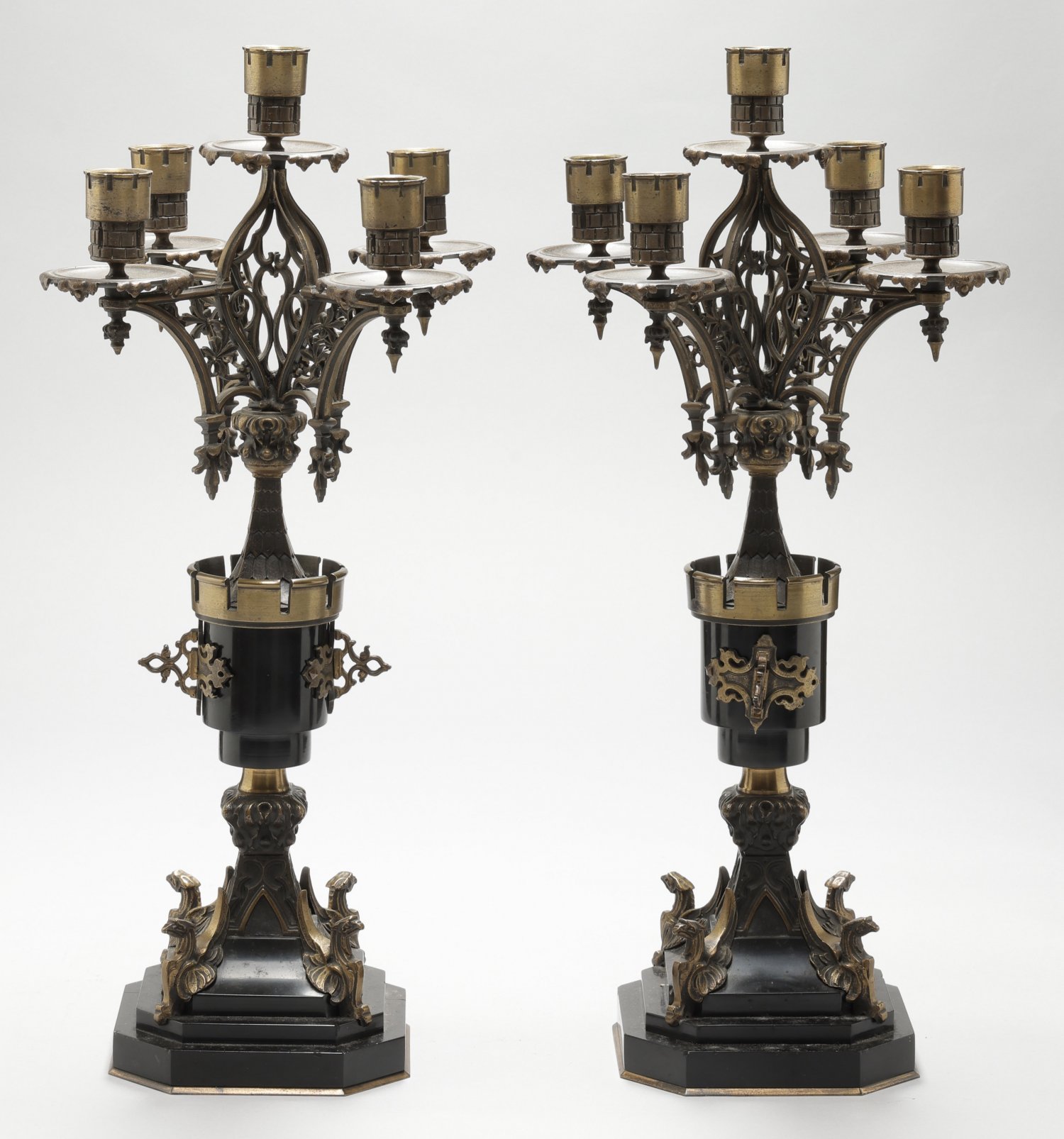 Paar Girandolen im neogotischen Stil 5-flg.; Schwarzer Steinguss und Bronze. Über oktogonalem, gestuft ansteigendem Sockel mit stilisierten Greifen gegliederter Schaft mit reliefiertem Maßwerk sowie architektonischem Abschluss in Form eines Turmes. Oberhalb davon ausgehend durchbrochen gearbeitete Leuchterarme sowie zylinderförmige Tüllen mit Zinnenabschluss. H. 47,5 cm.