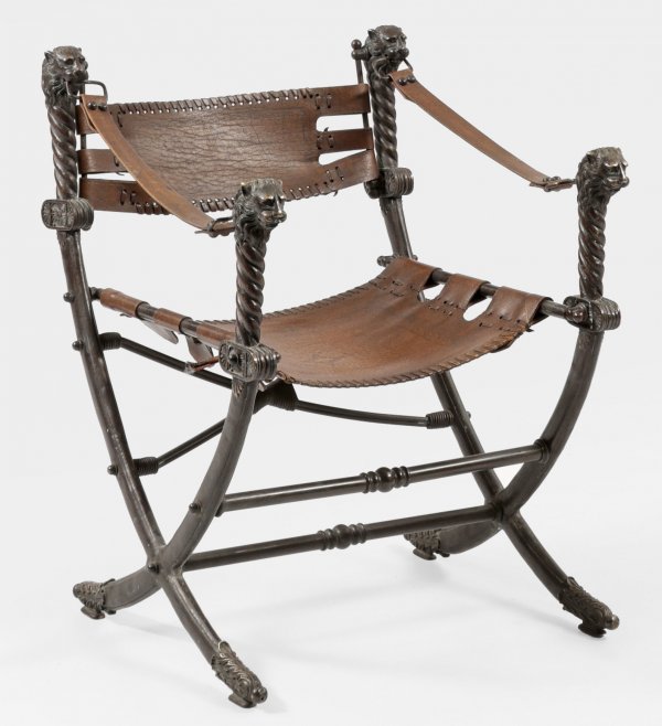 Armlehnsessel im Renaissance-Stil Bronze, dunkel patiniert sowie braunes Leder. Gestell aus stark geschwungenen, blattreliefierten und scherenartig angeordneten Streben mit vollplastisch gestalteten Löwenköpfen, durch Rundstäbe verbunden als Träger für lose gespannte Sitz- und Lehnenfläche sowie gurtähnliche Armlehnen. H. 87 cm. 68 cm x 68 cm cm. Sitz-H. 40 cm.