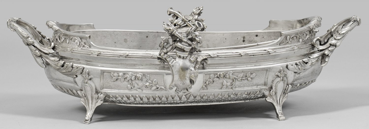 Prachtvolle Jardiniere Bronze, versilbert. Vier in Akanthus übergehende Standfüße einen ovalen, gebauchten Korpus tragend. Unterhalb umlaufender Palmettenfries. Wandung in Kartuschen floral reliefiert sowie front- und rückseitig reliefplastisches, von Fackel und Blasinstrument flankiertes leeres Wappenschild. Montierte Handhaben, die in Akanthusblätter übergehend sich an den Korpus anschmiegen. Herausnehmbarer Einsatz später. H. 14 cm. 50 cm x 24 cm.