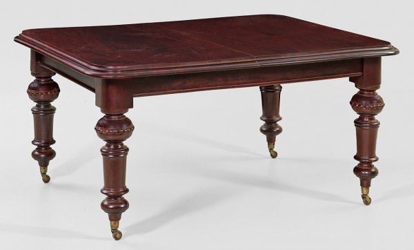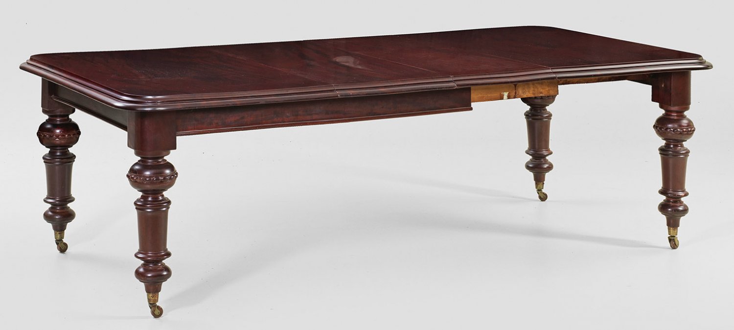 Viktorianischer Ausziehtisch Mahagoni, rot gebeizt. Gerade, profilierte Zarge auf kräftigen, mehrfach gegliederten Balusterbeinen auf Rollen. Umlaufend profilierte Deckplatte mit gerundeten Ecken. Zwei entsprechende Einsteckplatten. H. 75 cm. 122 cm x 154/240 cm.