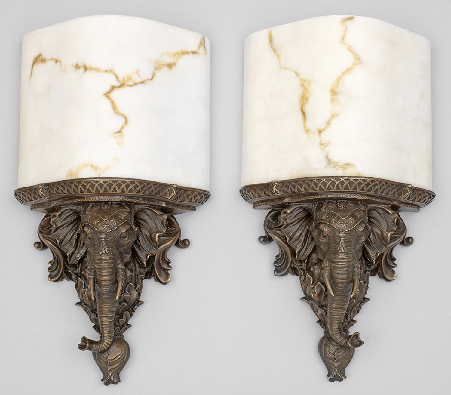 Paar extravagante Wandlampen 1-flg.; Bronze, braun patiniert sowie cremefarben marmoriertes Fieberglas. Detailreich ausgestalteter, konsolartiger Korpus in Form eines Elefantenkopfes, von üppigem Blattwerk umgeben. Oberhalb passig geschweifte Basis als Träger für Leuchtmittel mit bombiertem Lampenschirm. Elektrifiziert. H. 55 cm.