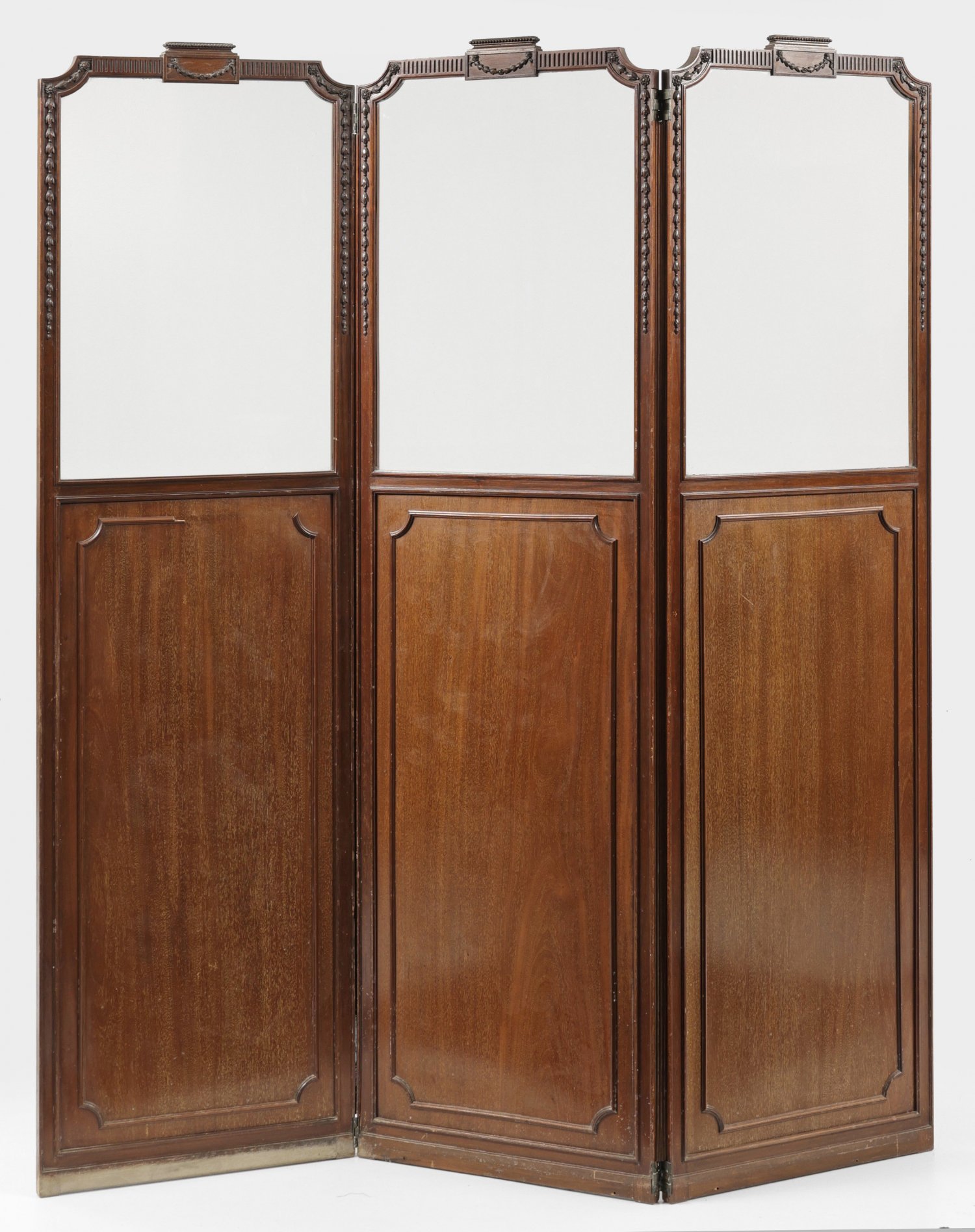 Edwardianischer Paravent 3-tlg.; Mahagoni. Gerade, hochrechteckige und umlaufend profilierte Paneele mit an den Ecken konkav eingezogenen oberen Abschlüssen sowie schauseitig Fries aus Kelchblüten. Große, farblose Glaseinsätze. Pro Paneel 185 cm x 53 cm.