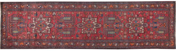 Heriz-Galerie Persien. Wolle auf Baumwolle. Im roten Innenfeld drei große, gekantete Rautenmotive sowie flächendeckende Musterung aus stilisiertem Blattwerk. Umlaufend braune Bordüre, flankiert von schmalen Nebenbordüren. 340 cm x 92 cm.