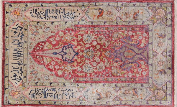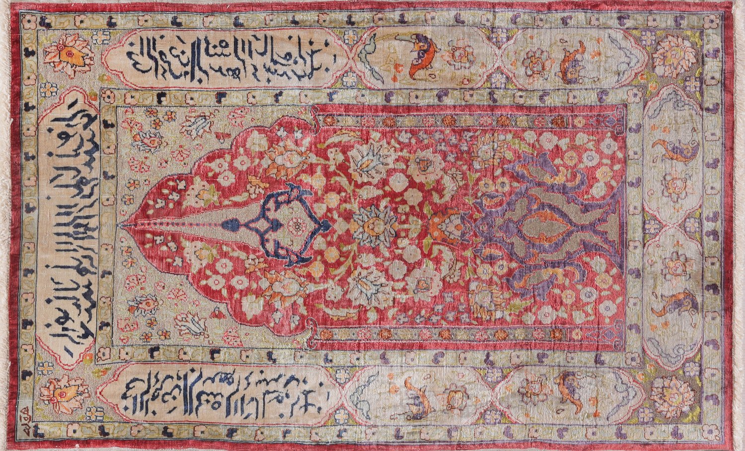 Signierte Hereke Seidenbrücke mit Metallbroschur Türkei. Seide auf Seide mit Metallbroschur. Feine Knüpfung. Auf hellrotem Fond passig geschweifte Gebetsnische mit großem Ampelmotiv sowie flächendeckender Blütenmusterung. Umlaufend breite Bordüre aus großen Schrift- und Blütenkartuschen, flankiert von schmalen Bordüren. Sign.; 79 cm x 48 cm.