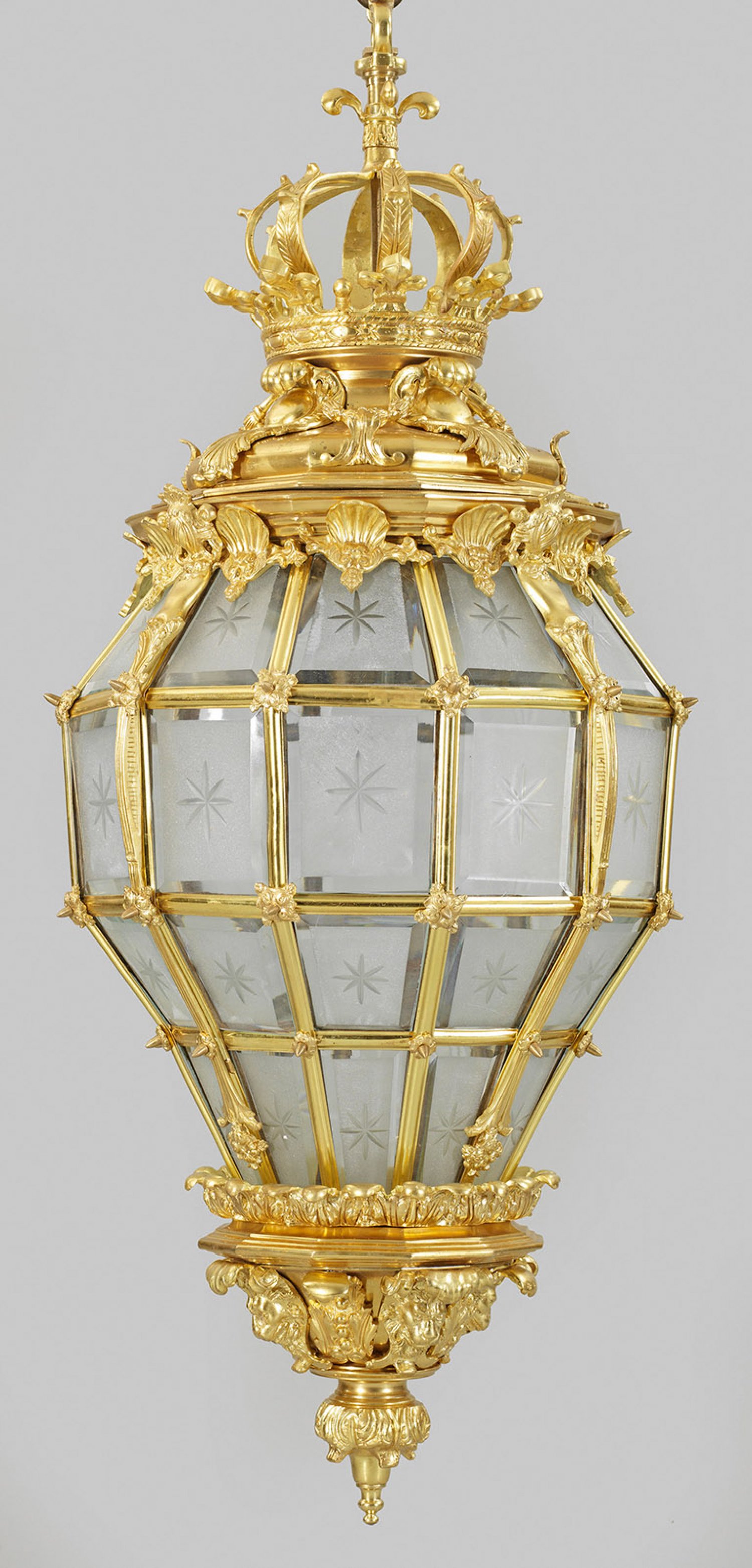 Prachtvolle Louis XVI-Deckenampel Bronze, vergoldet sowie farbloses, teilw. satiniertes Glas. Balusterförmiger, gekanteter Korpus aus schmalen Profilstegen mit reliefplastischen Löwenmaskarons, Blatt- und Muschelwerk. Offen gestalteter oberer Abschluss in Form einer großen Bügelkrone. Innen drei Lampenfassungen, elektrifiziert. H. 120 cm. D. 45 cm.