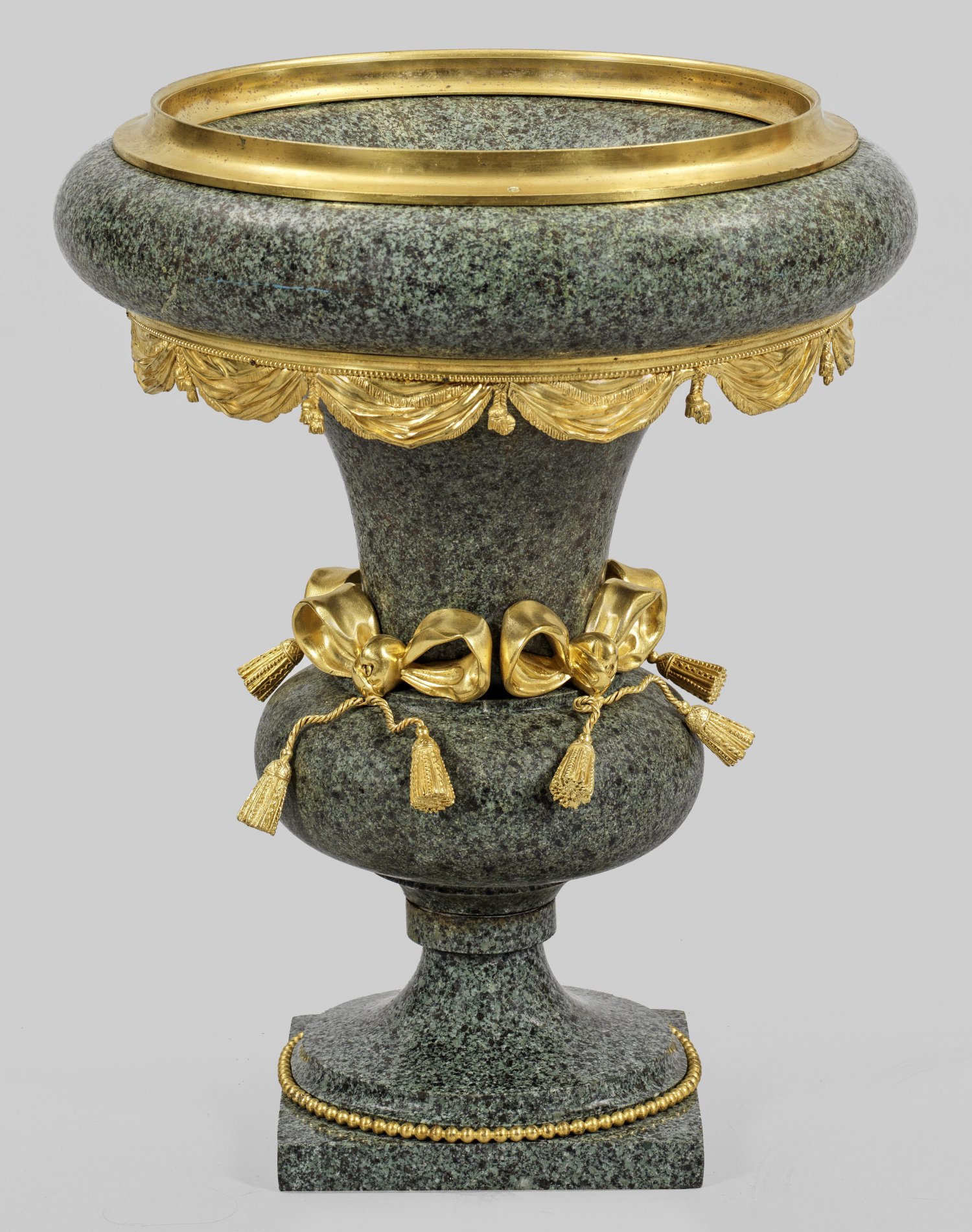 Große Prunkvase Grün gemaserter Serpentin und vergoldete Bronze. Balusterförmiger, tief eingezogener Korpus mit Perlstabfries sowie kräftigem, weit ausladendem Lippenrand mit umlaufender Profilierung. Unterhalb reliefplastisch gestaltetes Draperiewerk sowie umlaufend der Wandung Dekorationen aus großen Schleifenmotiven mit Quastenabschlüssen. Bez. BY. H. 56 cm.
