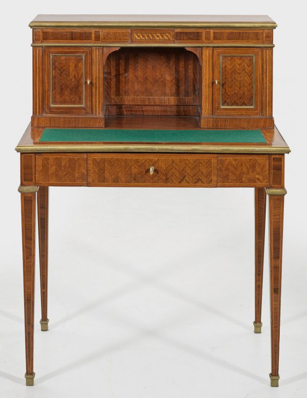 Louis XVI-Bonheur du Jour Palisander, furniert. Gerader, einschübiger Zargenkasten auf hohen Vierkantbeinen. Profilgerahmte Deckplatte mit Arbeitsfläche aus grünem Filz. Zurückgesetzter, zweitüriger Aufsatz mit gering überstehender Deckplatte. Flächendeckend teilw. gespiegelt angeordnete Furnierfelder, von Fadeneinlagen begrenzt. Profile aus Messing. H. 105,5 cm. 80 cm x 50 cm.