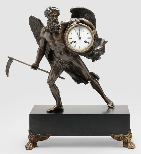 Große Skulpturen-Pendule Bronze, dunkelbraun patiniert sowie schwarz lackierter Stein. Vollplastische Darstellung des schreitenden Chronos mit Sense als Sinnbild für die verstreichende Zeit. Unter seinem Arm rundes Uhrengehäuse. Verglastes, weißes Emailzifferblatt, bez. Linzeler à Paris. Umlaufend reliefierte Schlange als Ewigkeitsmotiv. Unterhalb rechteckiger Sockel mit Tatzenfüßen. Messingwerk mit Halbstundenschlag auf Glocke. H. 53 cm. 41 cm x 21 cm.