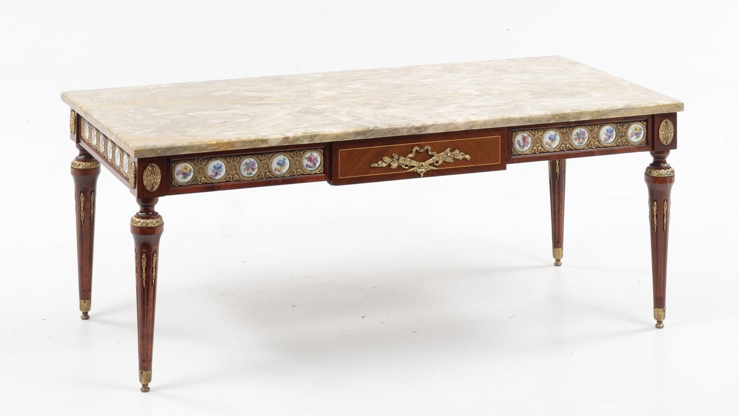 Couchtisch im Louis XVI-Stil Mahagoni, massiv und furniert sowie vergoldete Bronze und polychrom gestaltete Porzellanplaketten. Gerade Zarge auf kannelierten Balusterbeinen, umlaufend mit Dekorationen aus blütengefüllten Tondi als Träger für rechteckige Deckplatte aus beigefarben gemasertem Marmor. H. 47,5 cm. 118 cm x 58 cm.