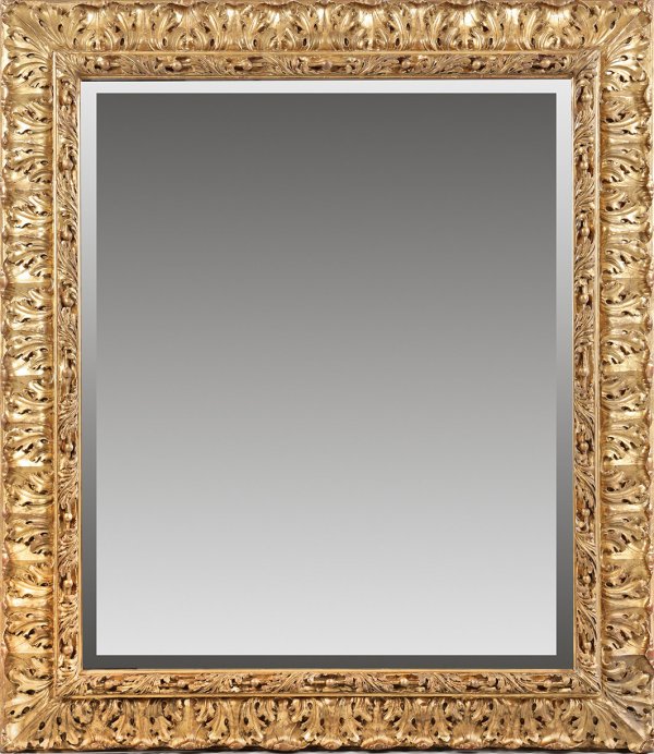Großer Belle Epoque Wandspiegel Holz, stuckiert, gefasst und vergoldet. Breite, rechteckige Spiegelrahmung aus üppigem, reliefplastisch gestaltetem Akanthusblatt und schmalen Profilen. Facettiertes Spiegelglas. 157 cm x 134 cm.