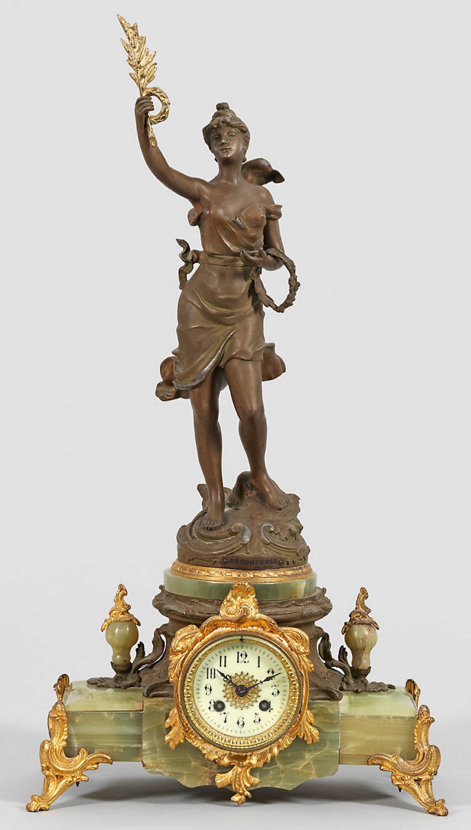 Belle Epoque-Kaminuhr "Récompense" Hellgrüner Onyx und bronzefarben patinierter Zinkguss. Vollplastische Darstellung einer jungen Dame, einen Siegerpreis überreichend, auf gestuft ansteigendem Rocaillesockel. Emailzifferblatt. Pendulenwerk mit Pendelfeder sowie Halbstundenschlag auf Glocke. Platine bez. Medaille d'or. H. 68 cm. 36 cm x 18 cm.