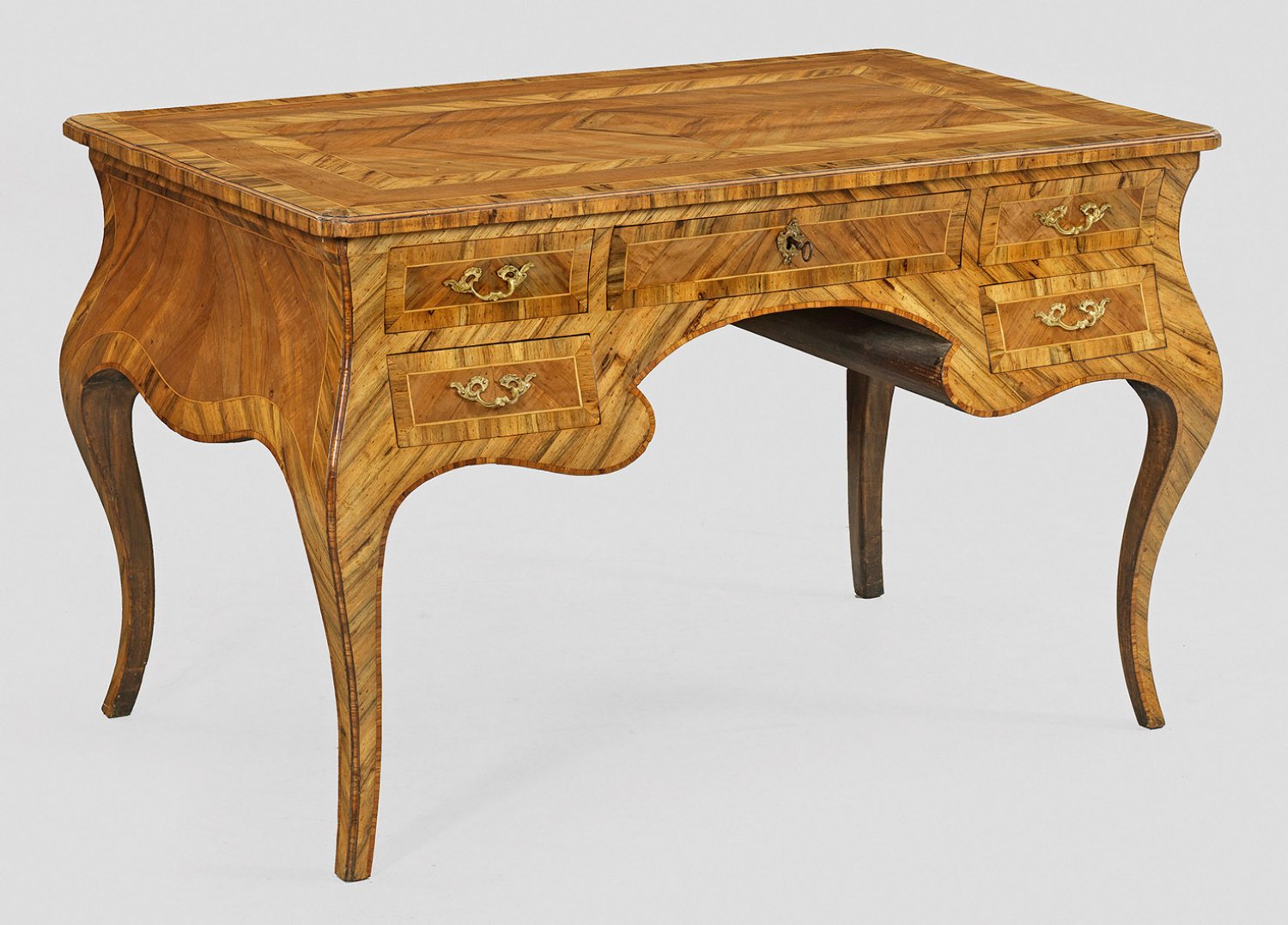 Louis XV-Schreibtisch Nussbaum, furniert. Konkav eingezogener Korpus mit weit ausgezogenen, profilierten Ecklisenen auf geschwungenen Beinen. In der gegliederten Front geschweiftes Kniefach sowie fünf Schubladen unterschiedlicher Größe. Gering überstehende Deckplatte mit gerundeten Ecken. Flächendeckend breit gerahmte, gespiegelt angeordnete Furnierfelder, von schmalen Fadeneinlagen begrenzt. H. 79 cm. 127 cm x 78 cm.