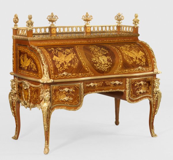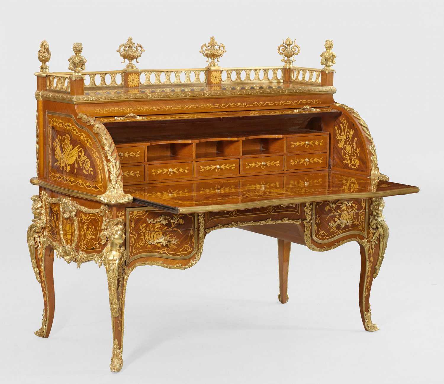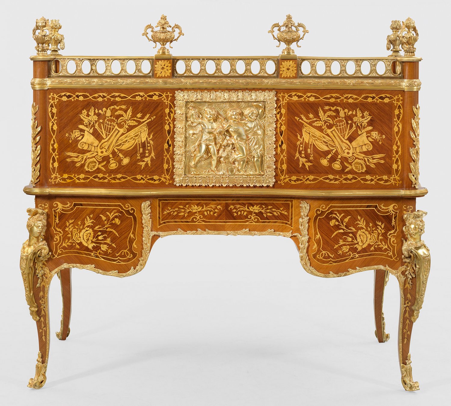 Mahagoni und Palisander, furniert sowie Marketerie aus teilw. schattiertem Ahorn. Reiche Applikationen aus vergoldeter Bronze. Bombierter Zargenkasten, flankiert von gerundeten Ecklisenen mit vollplastisch gestalteten Hermenfiguren auf geschweiften Beinen. In der gegliederten Front breites Kniefach sowie fünf Schubladen unterschiedlicher Größe. Oberhalb großzügiges Sekretärelement mit rückseitigem Puttenrelief sowie ausziehbarer Arbeitsfläche und bombiertem Zylinderverschluss. Dahinter gestaffelte Facheinteilung. Durchbrochen gearbeitete Galerierahmung mit großen Vasenbekrönungen. Allseitig breit gerahmte, gespiegelt angeordnete Furnierfelder mit reicher Marketerie aus Attributen der Musik und üppigen Blüten. H. 150 cm. 166 cm x 88 cm.