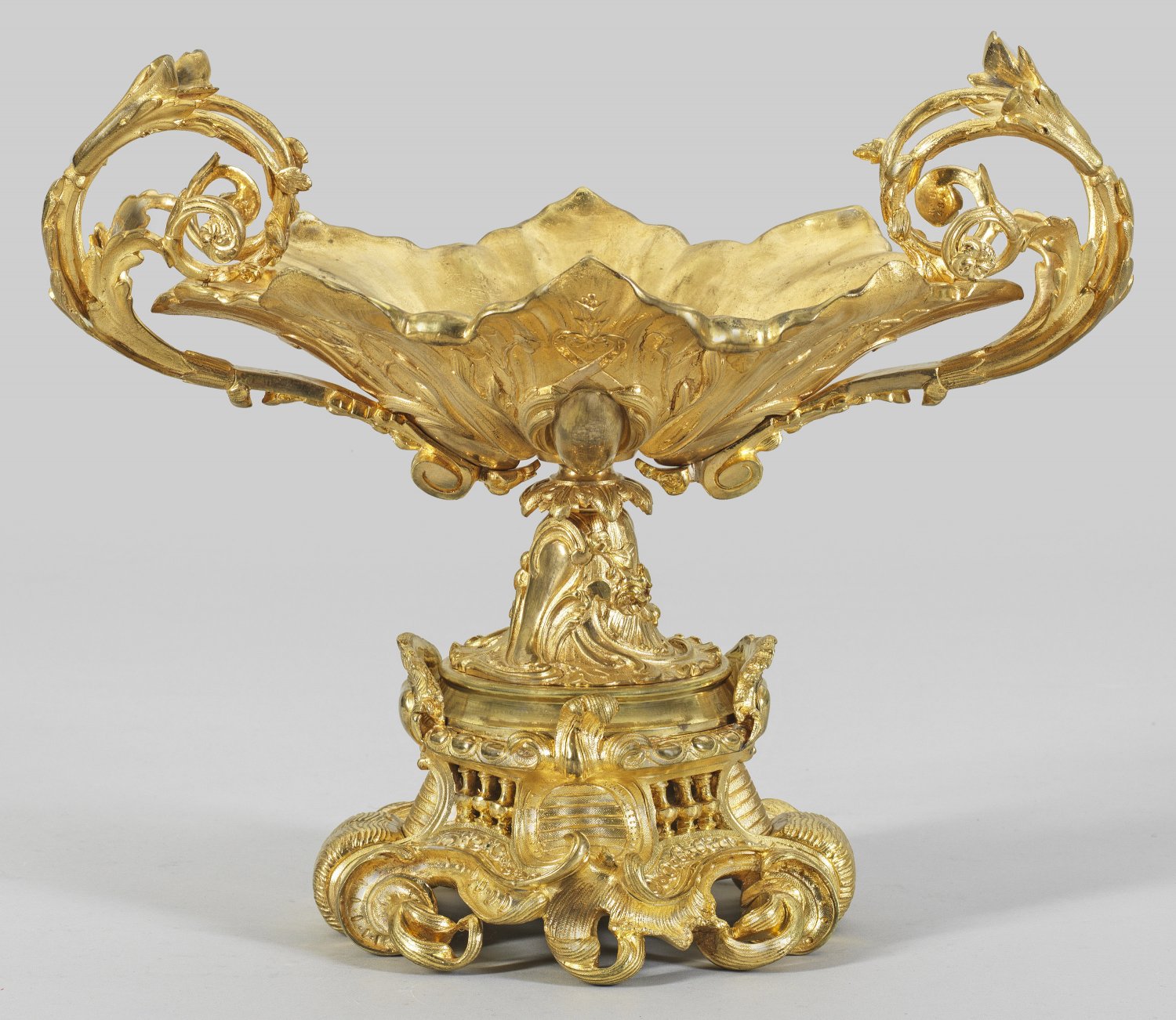 Große Belle Epoque-Prunkjardinière Bronze, vergoldet. Über durchbrochen gearbeitetem, geschweift ansteigendem Sockel aus üppigen, gegeneinandergestellten Voluten und gereihten Balusterstäben korrespondierender, sich konisch verjüngender Schaft als Träger für ovale, tief gemuldete und umlaufend reliefierte Schale. Seitlich großzügig angelegte Henkel aus eingerollten Blattvoluten. H. 34 cm. 41 cm x 23 cm.