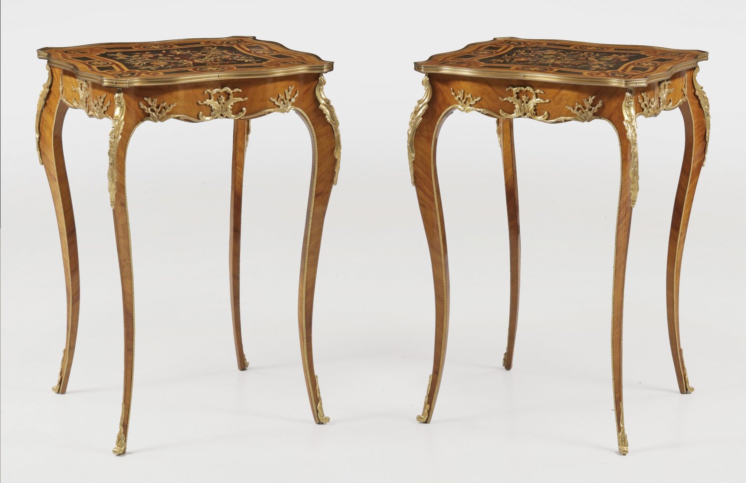 Paar Beistelltische im Louis XV-Stil Rosenholz, furniert sowie Einlagen aus gefärbten Edelhölzern. Applikationen aus vergoldeter Bronze. Passig geschweifte Zarge auf hohen, geschwungenen Beinen als Träger für profilgerahmte Deckplatte mit großer Blütenintarsie, von Bandeinlagen begrenzt. H. 78 cm. 54 cm x 54 cm.